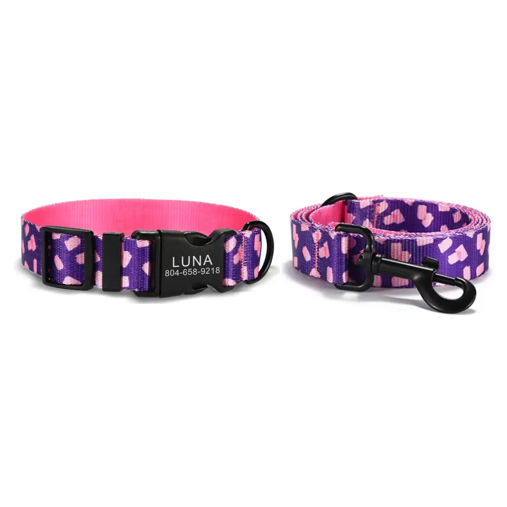 Nombre del producto: Collar personalizado para perros con grabado gratuito, correa para mascotas a juego, hebilla de contacto personalizada, collar para mascotas rosa caramelo púrpura