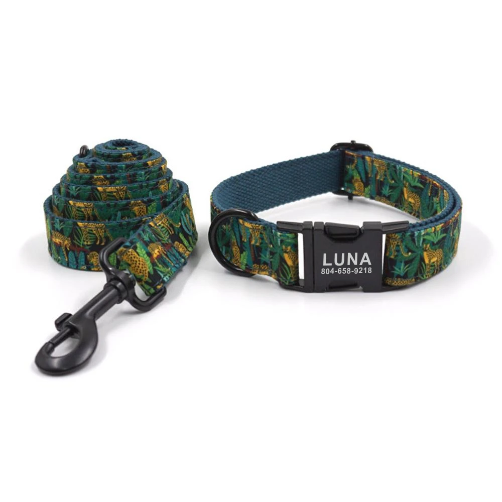 Collar de perro personalizado con grabado gratuito, correa para mascotas a juego, hebilla de Metal de contactos personalizados, Collar para cachorro de leopardo y jungla