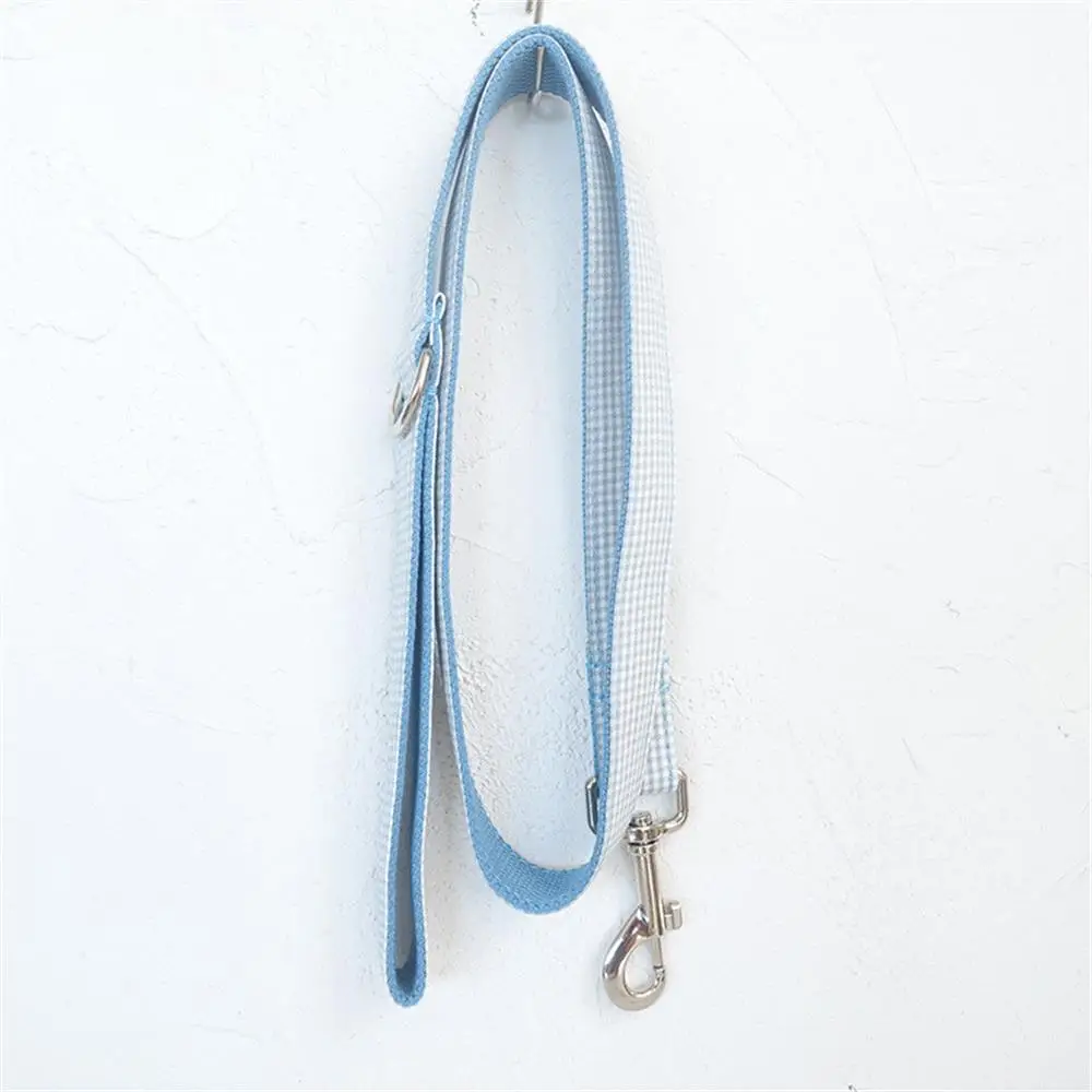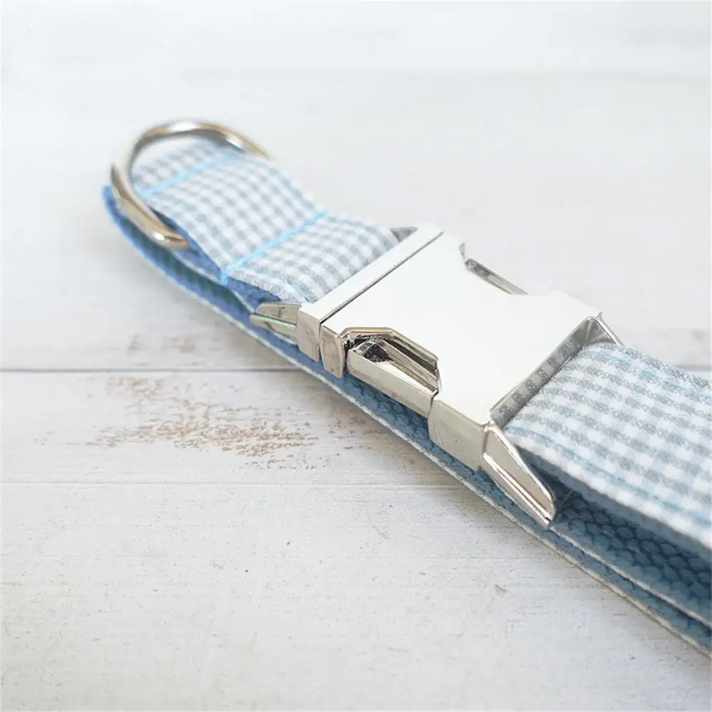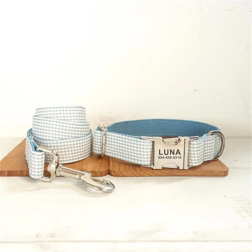 Nombre del producto: Collar personalizado para mascotas, grabado gratuito, placa con nombre personalizada para cachorros y gatos, etiqueta de identificación, collares básicos de cuadros azules ajustables, juego de correa de plomo