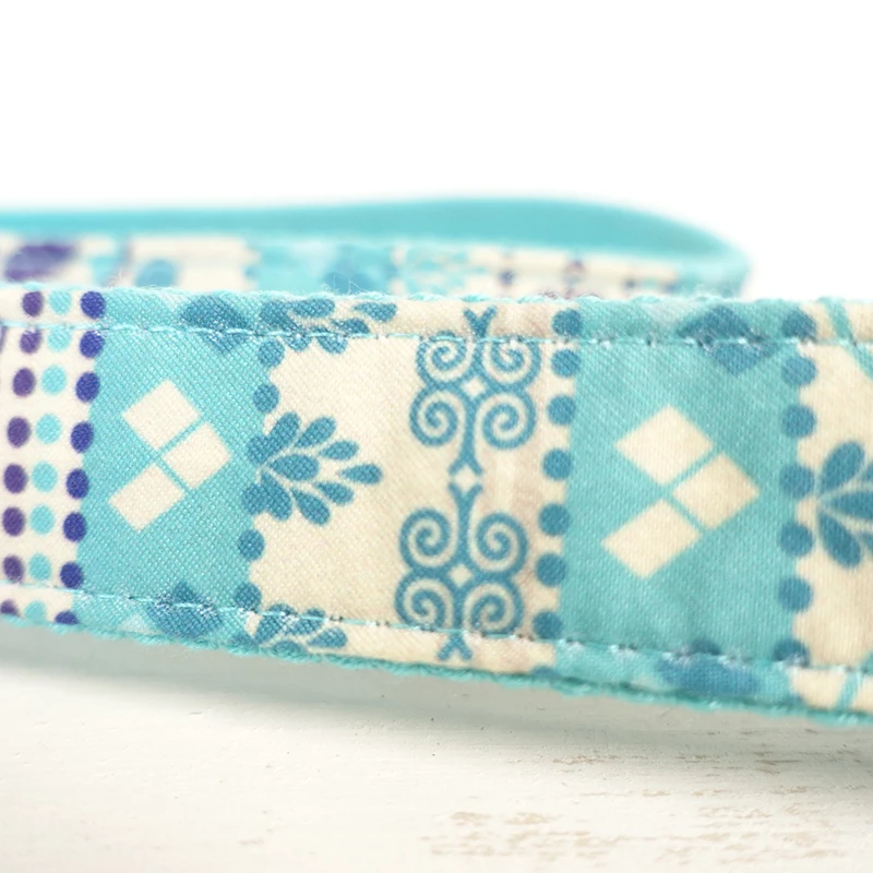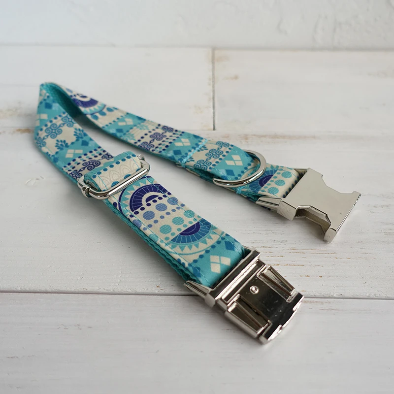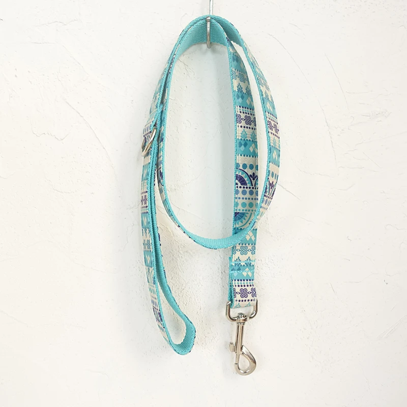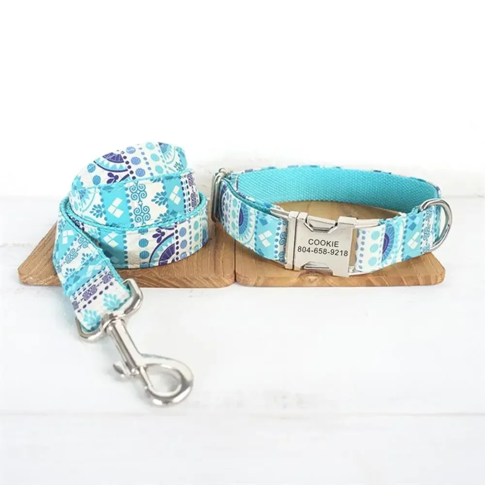 Nombre del producto: Collar personalizado para mascotas, placa con identificación personalizada, etiqueta de identificación, collares para perros y gatos de estilo nacional étnico azul claro ajustable, juego de correa de plomo