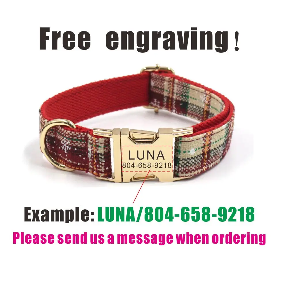 제품 이름: 개인화 된 개 목걸이 사용자 정의 애완 동물 목걸이 무료 조각 ID 이름 태그 애완 동물 액세서리 크리스마스 두꺼운 섬유 강아지 목걸이 가죽 끈 세트