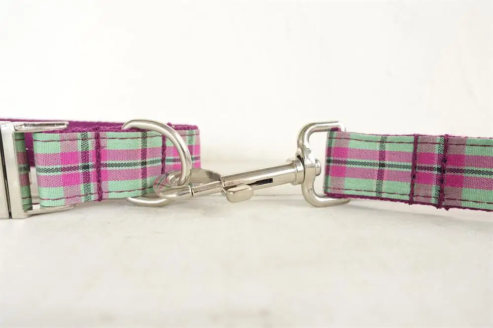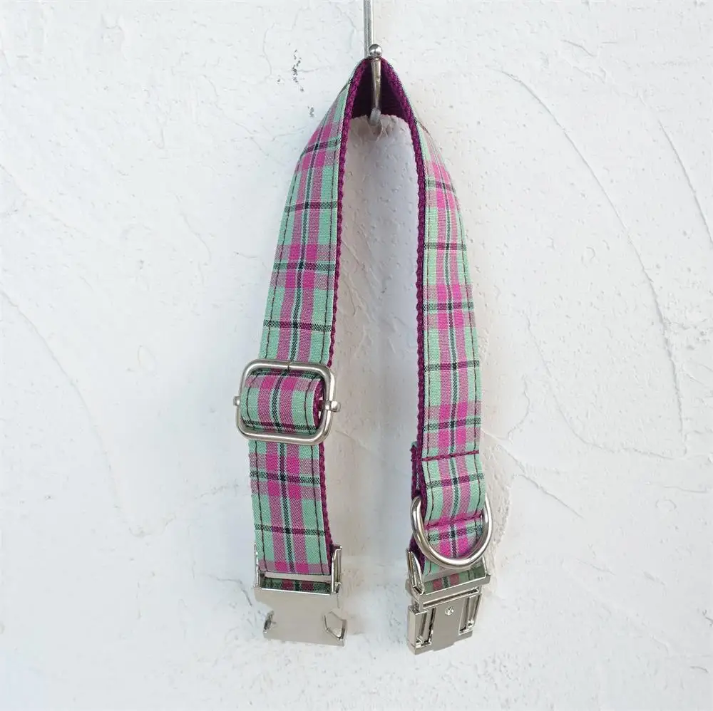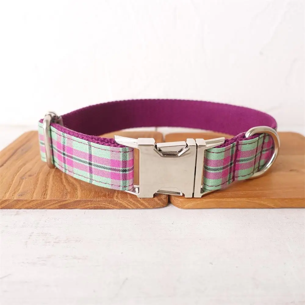Nombre del producto: Collar personalizado para perro Collar personalizado para mascota Grabado gratuito Etiqueta de nombre de identificación Accesorio para mascota Collar de cachorro a cuadros verde púrpura Juego de correa