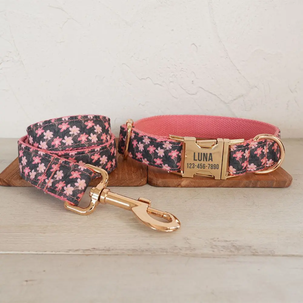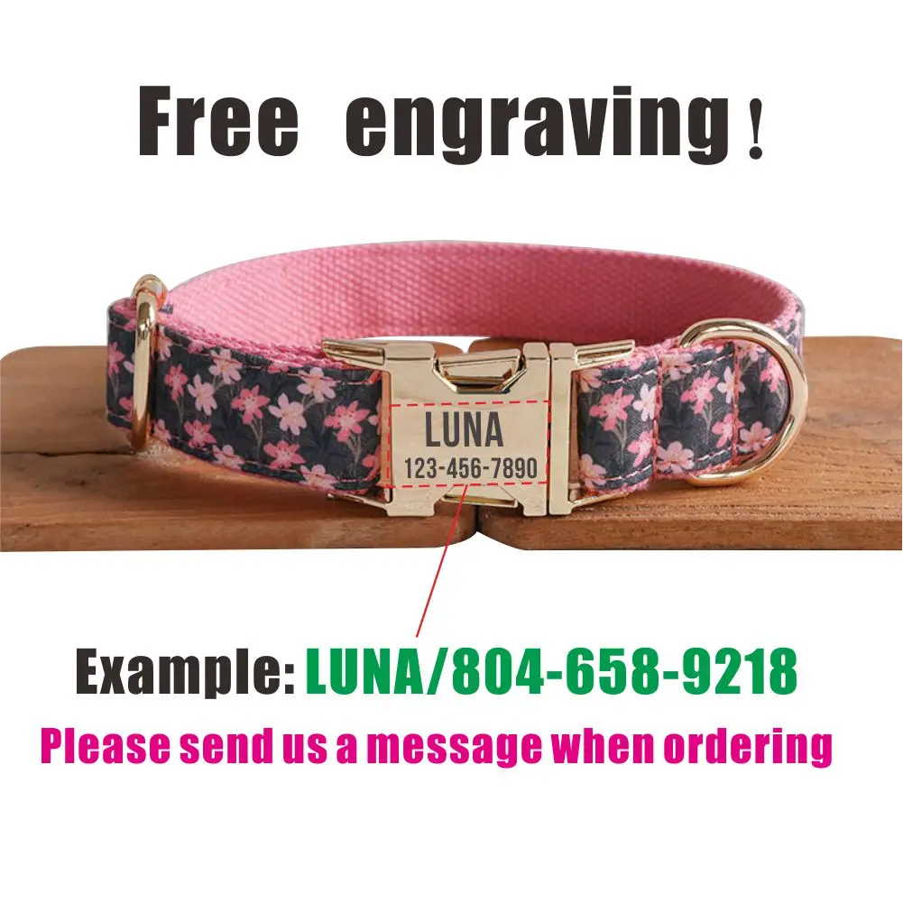 Nombre del producto: Collar para perro personalizado con grabado gratuito, Correa para mascotas a juego, Hebilla de metal con contactos personalizados, Collar para mascotas con flores negras y rosas