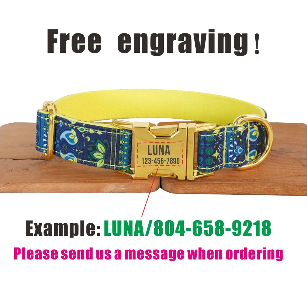 Nombre del producto: Collar de perro personalizado con grabado gratuito, Correa para mascotas a juego, Hebilla de metal con contactos personalizados, Collar de césped acuático dorado
