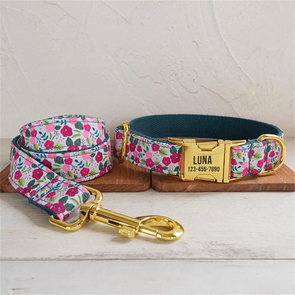 Nombre del producto: Collar de perro personalizado con grabado gratuito, Correa para mascotas a juego, Hebilla de metal con contactos personalizados, Collar de perro de flores poco profundas