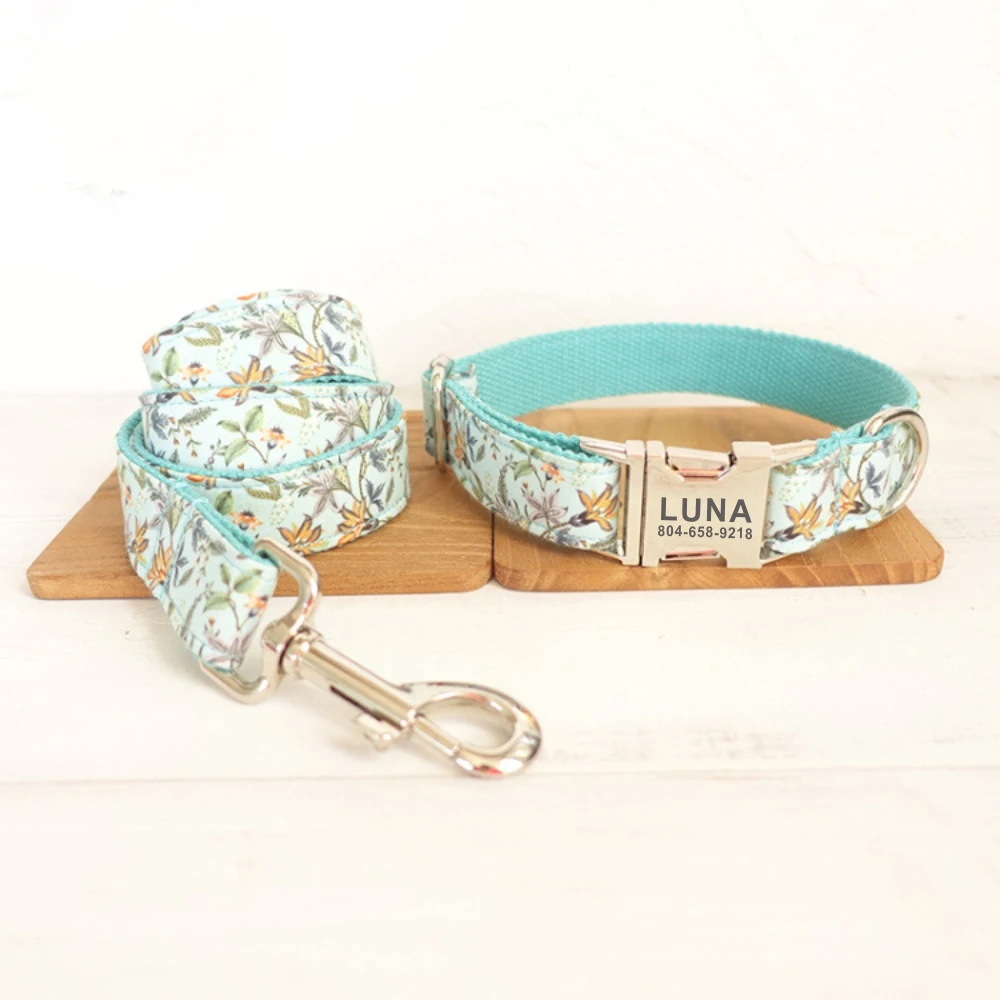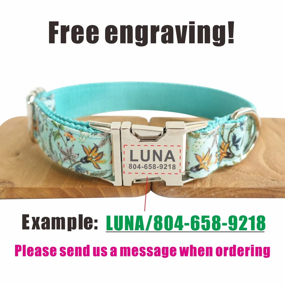 Nombre del producto: Collar personalizado para mascotas, placa con identificación personalizada, etiqueta de identificación, collares para perros y gatos con flores claras de agua ajustables, juego de correa de plomo