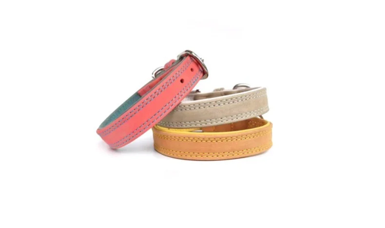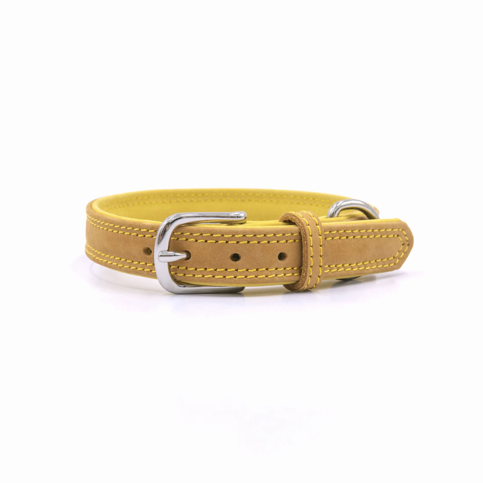 Collar de perro de piel de vaca amarilla de grano superior, Collar de mascota impermeable ajustable de cuero real, cables de perro a juego de dos tonos suaves de doble capa