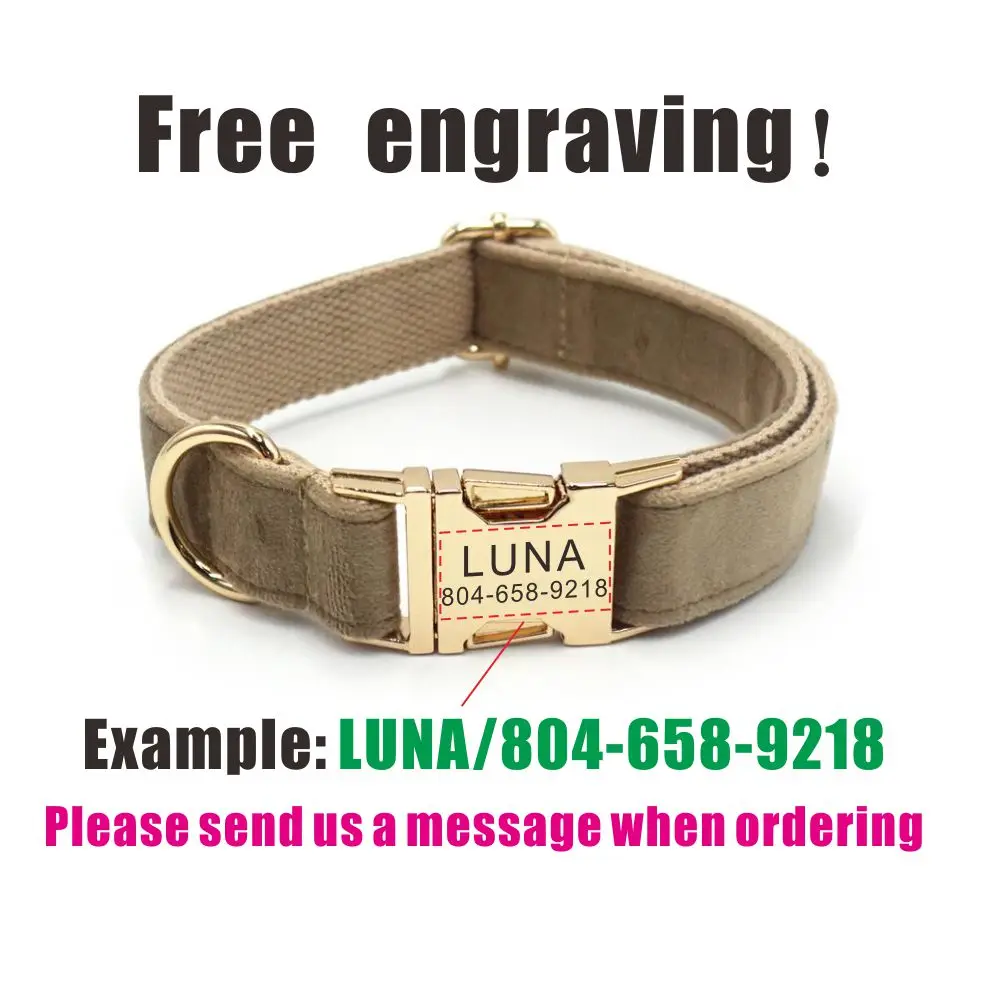 Nombre del producto: Collar de perro de terciopelo grueso de café personalizado con grabado gratis, collares de cachorro de mascota con hebilla de Metal personalizados, correa a juego disponible
