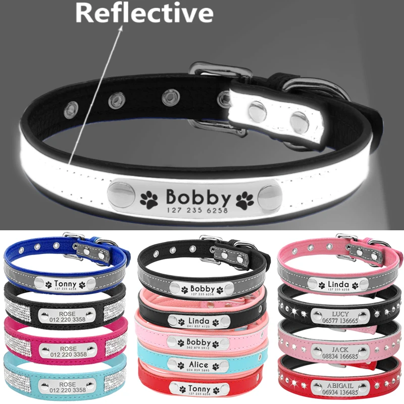 Tipo: Collar de cuero PU personalizado para perros y gatos Collar de cristal personalizado para cachorros Collares grabados para mascotas para perros pequeños y medianos Pitbull Chihuahua