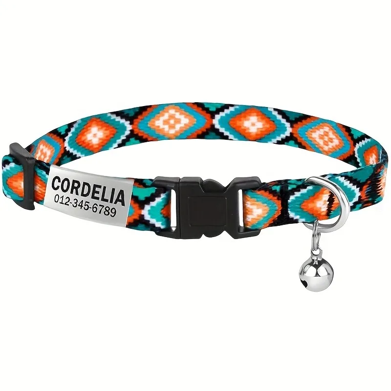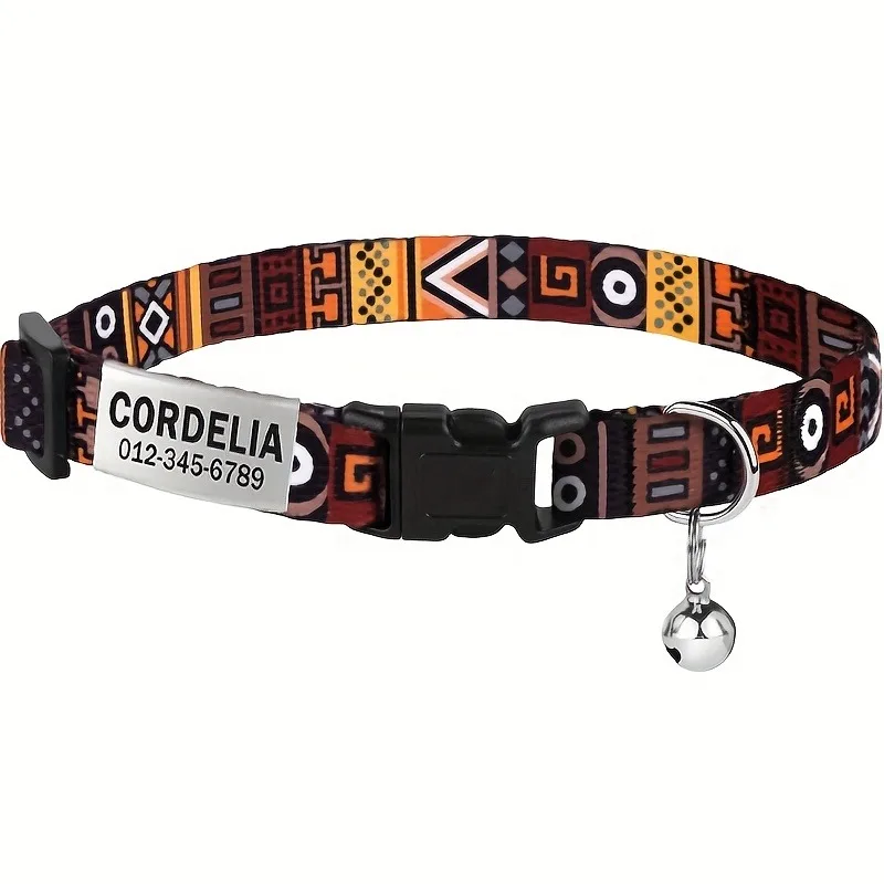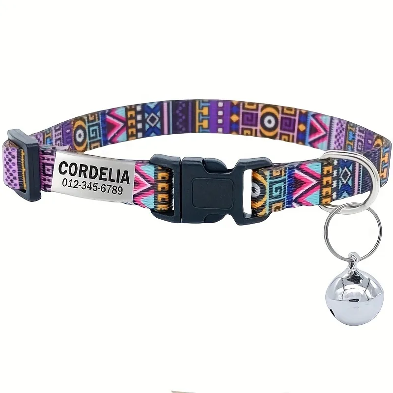 Collar personalizado de estilo étnico bohemio para perro y gato, nombre grabable, número de teléfono, etiqueta de identificación, poliéster duradero, antideformación