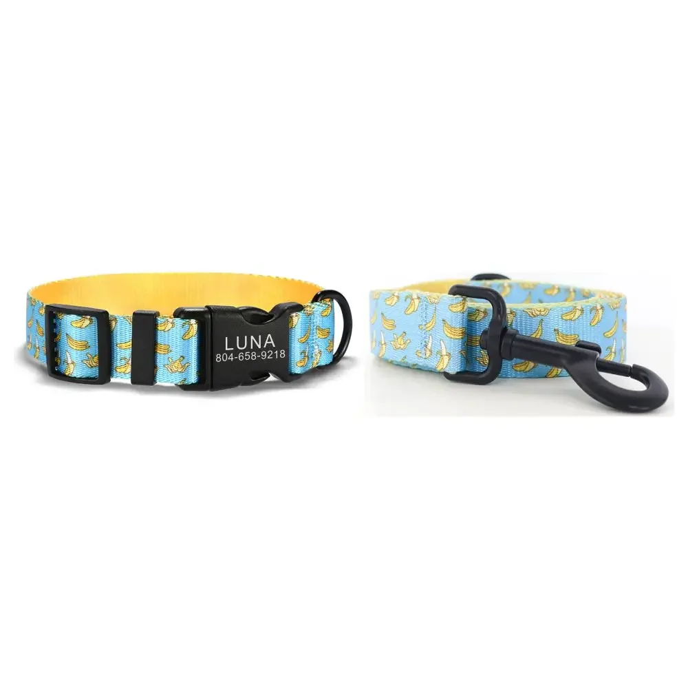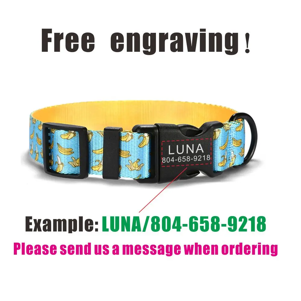 Nombre del producto: Collar personalizado para mascotas, placa con identificación personalizada, plátano azul ajustable, collares para perros y gatos de fibra suave, correa de plomo