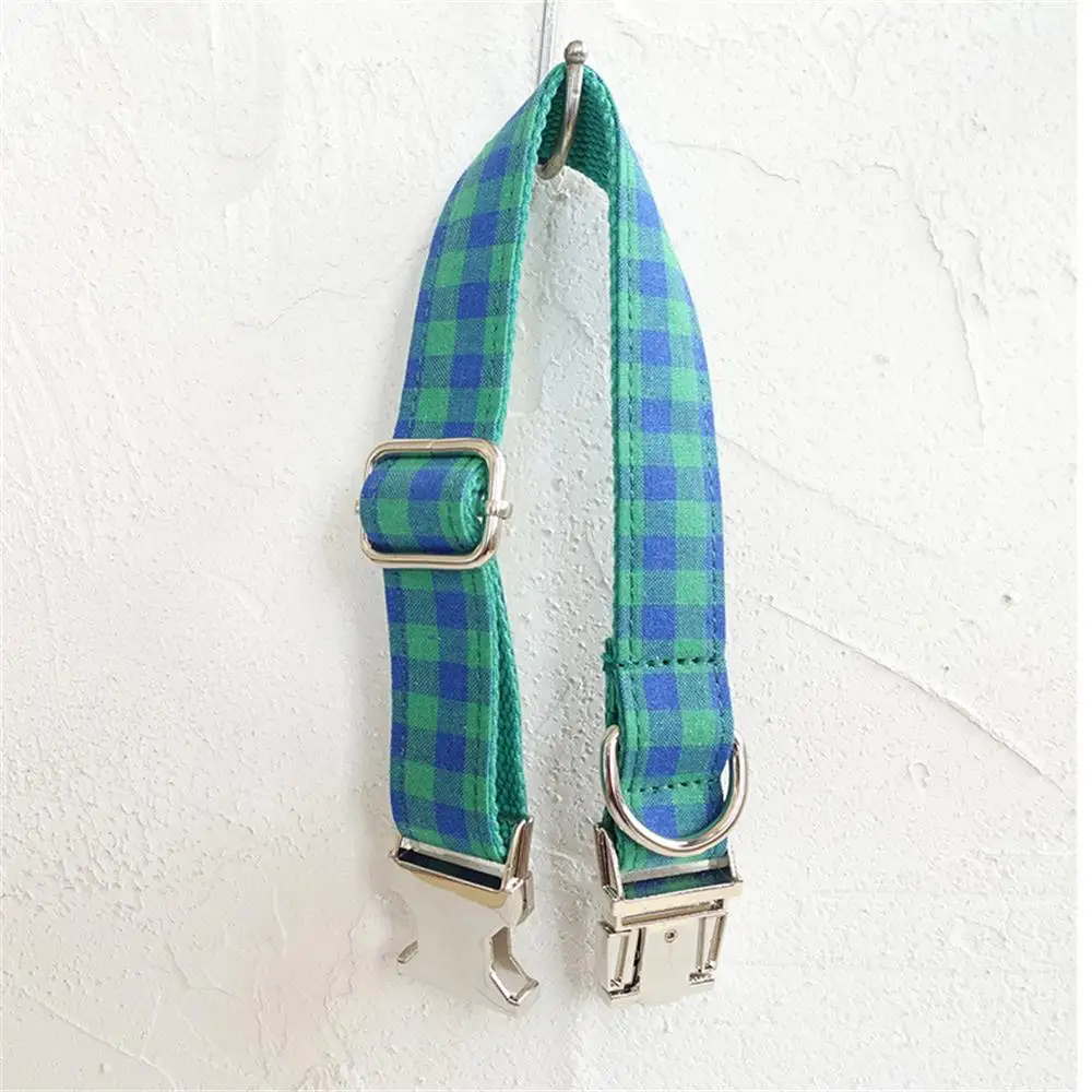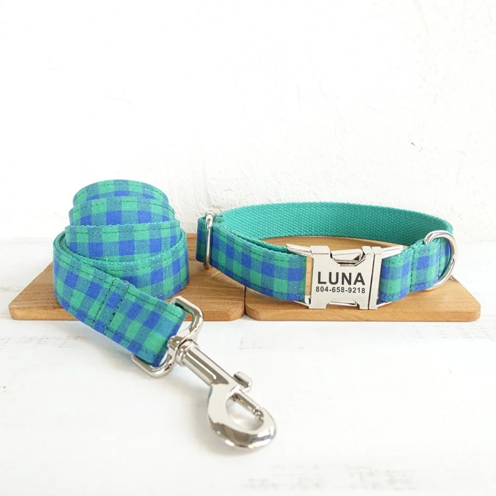 Collar personalizado para mascotas, grabado gratis, placa con nombre personalizada para cachorro, etiqueta de identificación, hebilla ajustable, traje verde y azul, collares a cuadros, correa