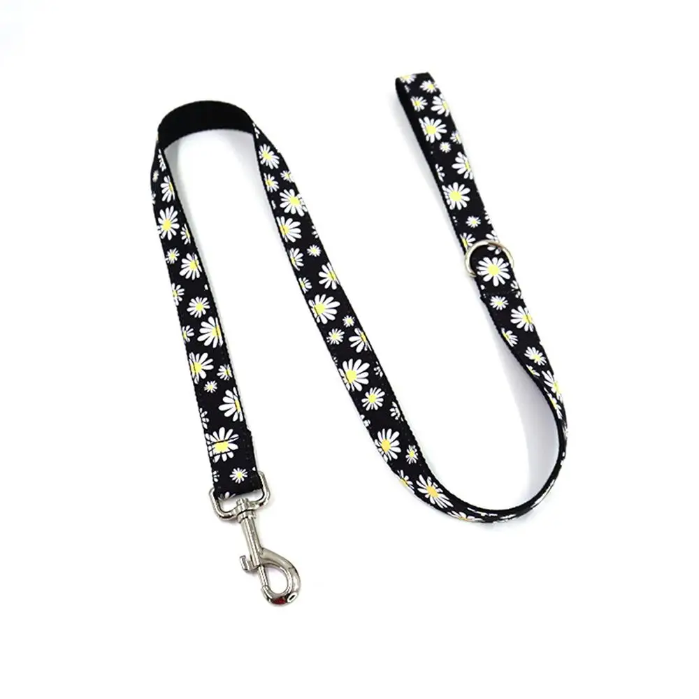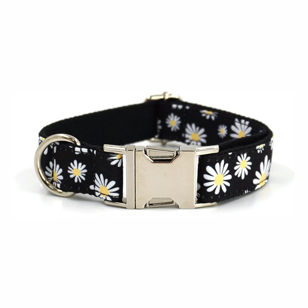 Nombre del producto: Collar personalizado para mascotas, placa con nombre personalizada para cachorros, etiqueta de identificación, hebilla ajustable, collares básicos de flores de margarita negras fuertes, juego de correa de plomo