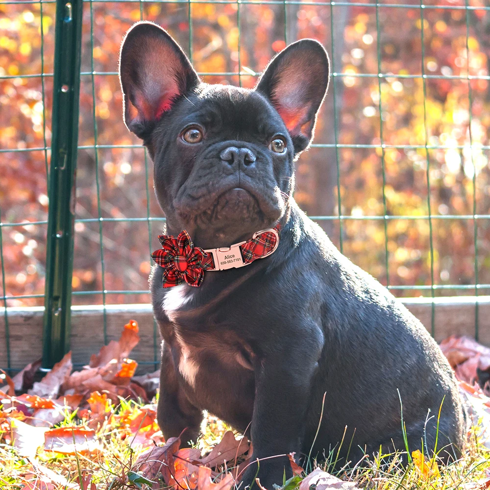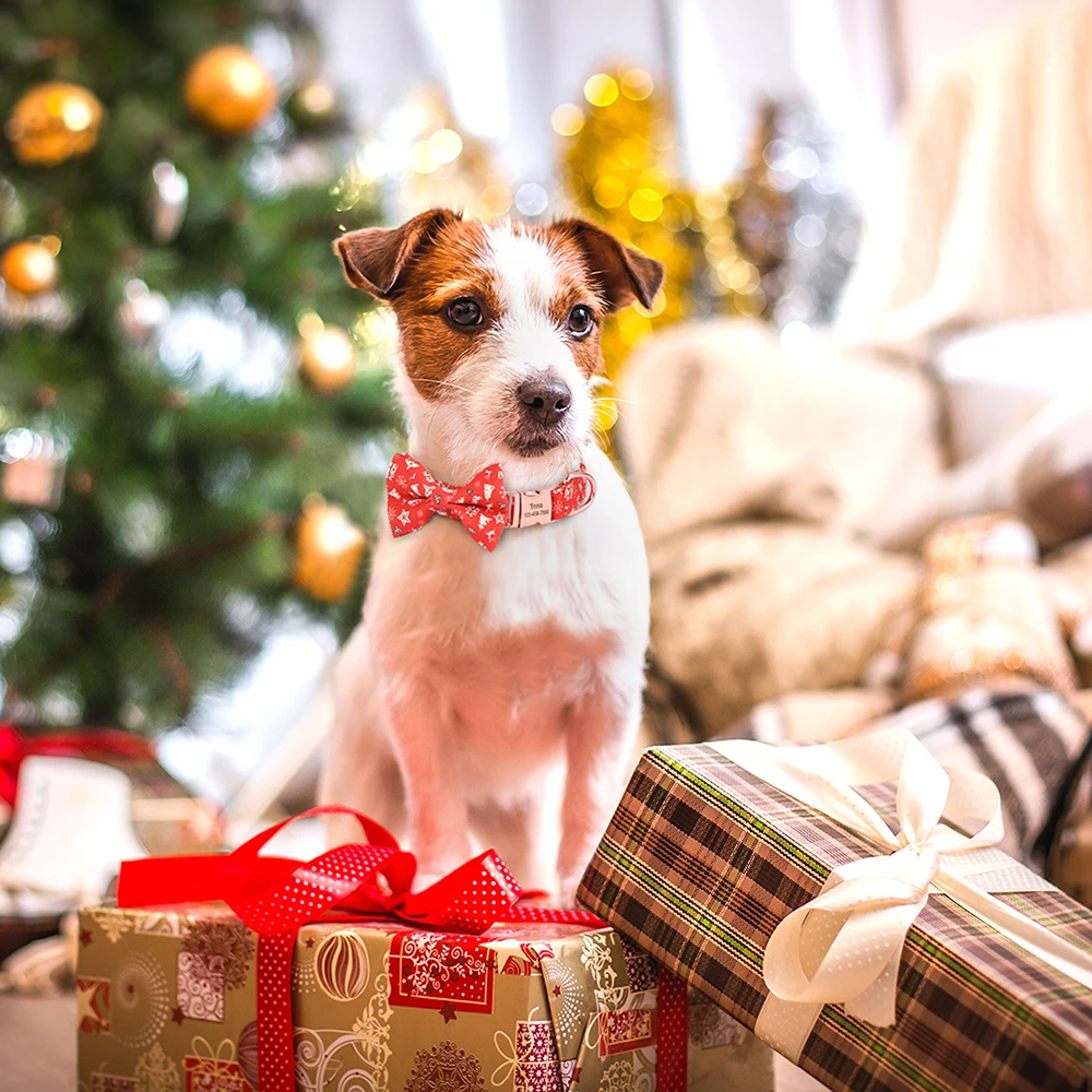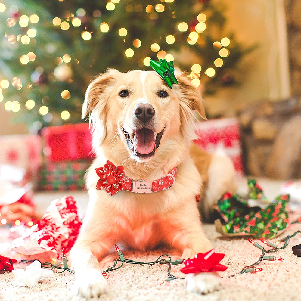 Tipo: Collar de Navidad personalizado para perro, collar de perro a cuadros con lazo, collares para mascotas, collares de identificación de cachorro de gato con flores para perros pequeños, medianos y grandes