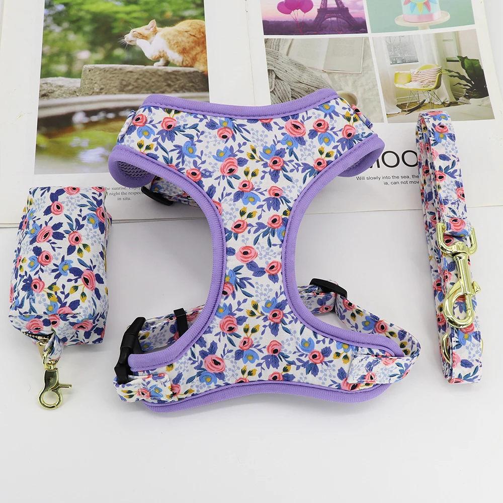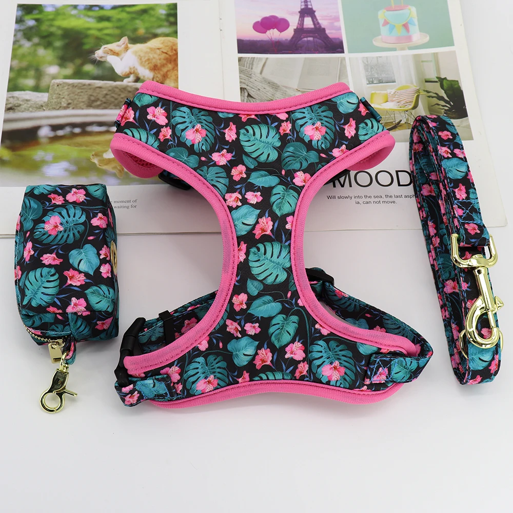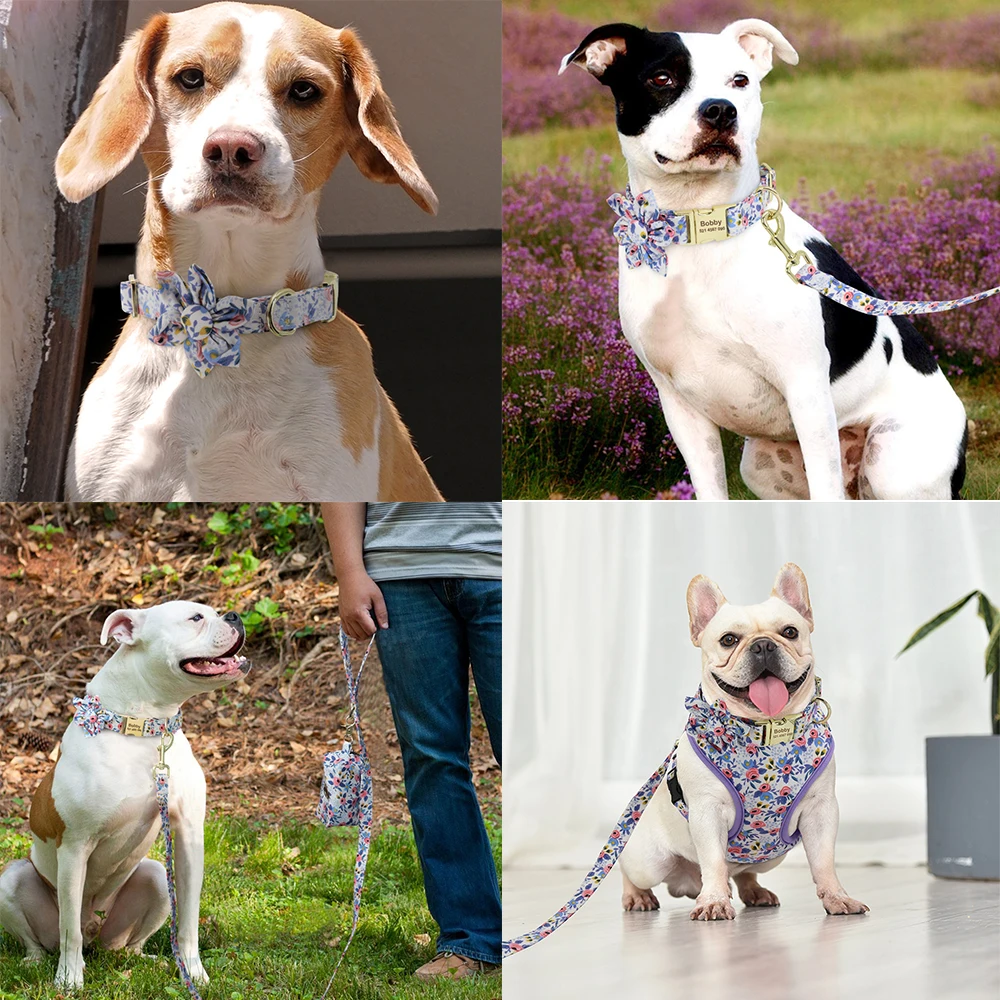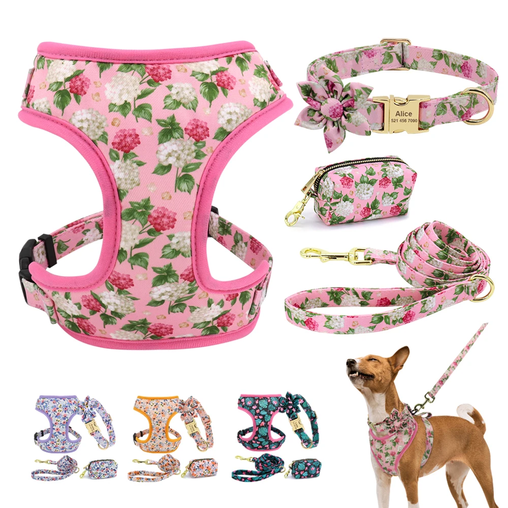 Collar personalizado para perro, correa, arnés, bolsa de golosinas, Collar grabado Floral para mascotas, soporte para bolsa de caca para perros pequeños, medianos y grandes, 3 unids/set