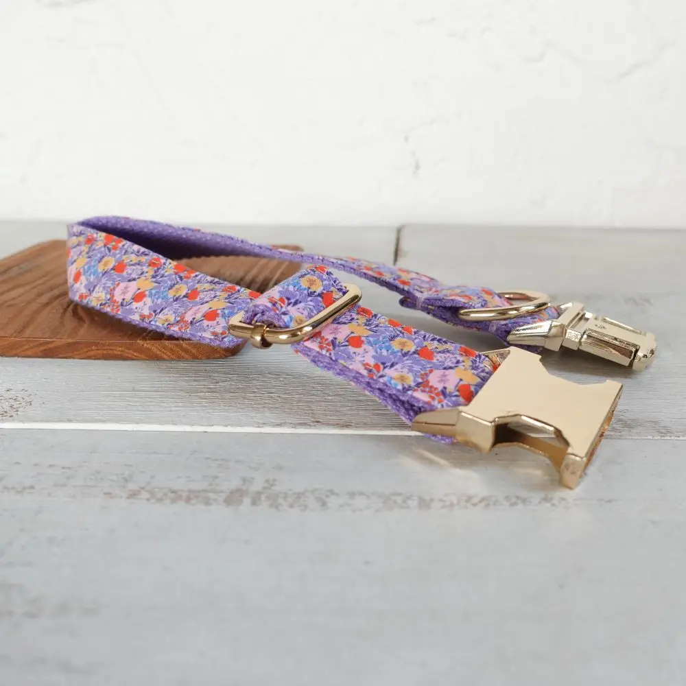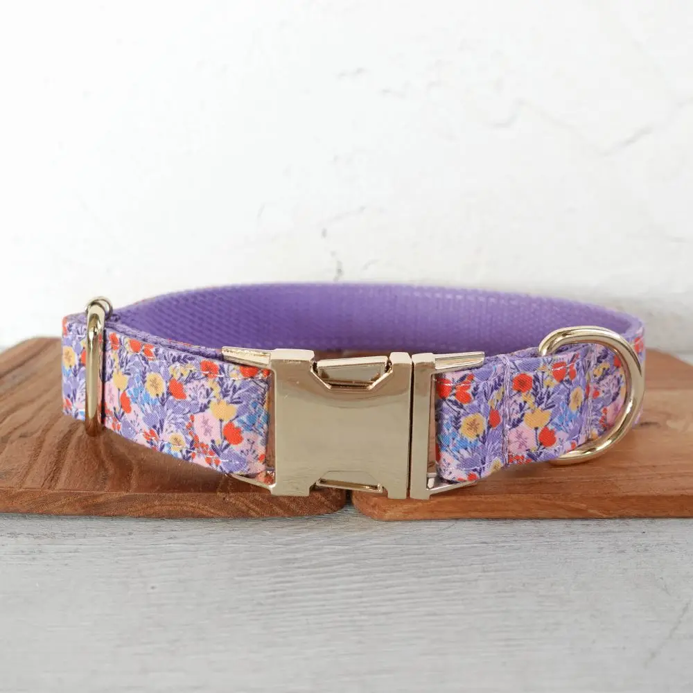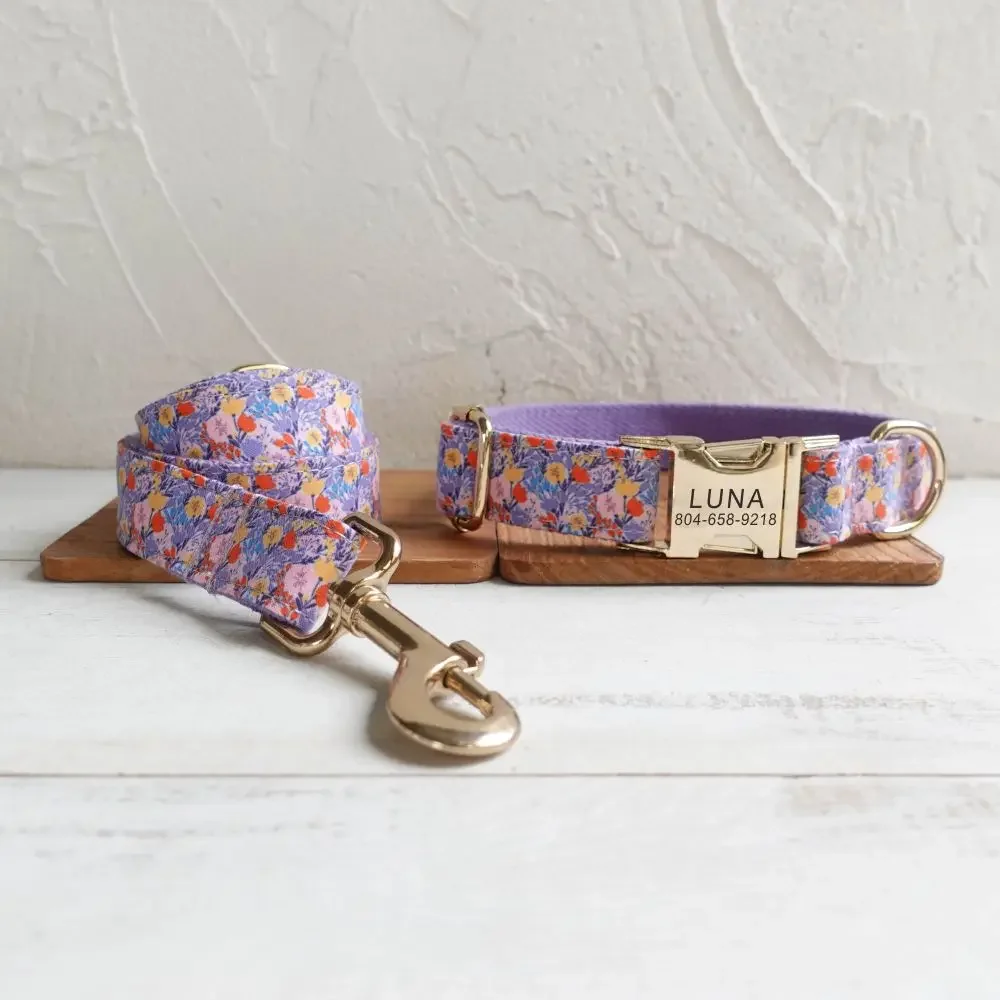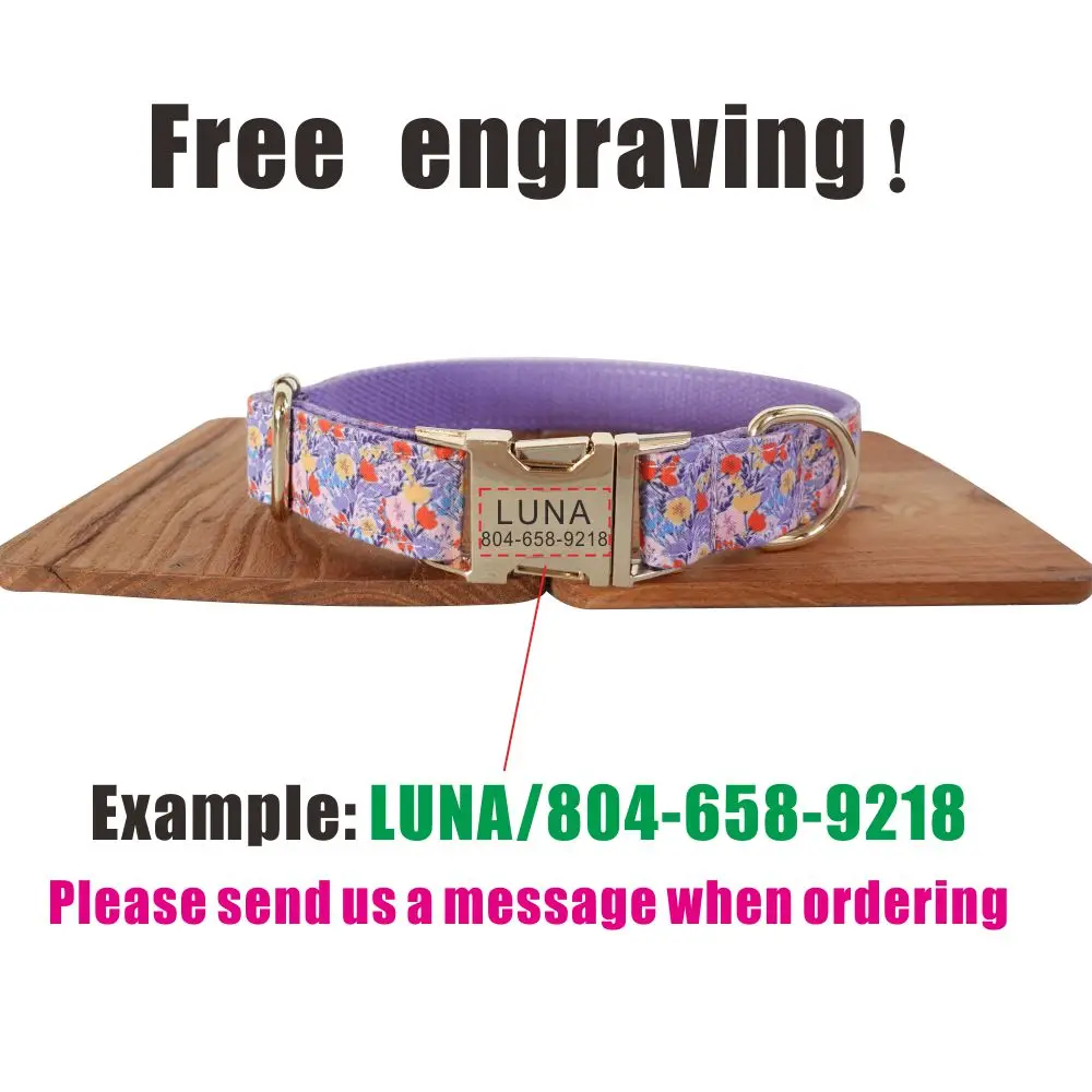 Nombre del producto: Collar personalizado para perros Collar personalizado para mascotas Grabado gratuito Etiqueta de nombre de identificación Accesorio para mascotas Juego de correa de collar de fibra para cachorros de flores moradas