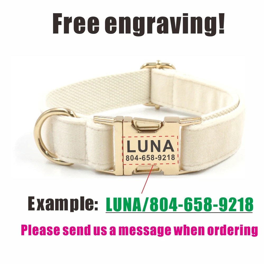 Nombre del producto: Collar personalizado para perros Collar personalizado para mascotas Grabado gratuito Etiqueta de nombre de identificación Accesorio para mascotas Juego de correa de collar de cachorro de fibra de terciopelo blanco