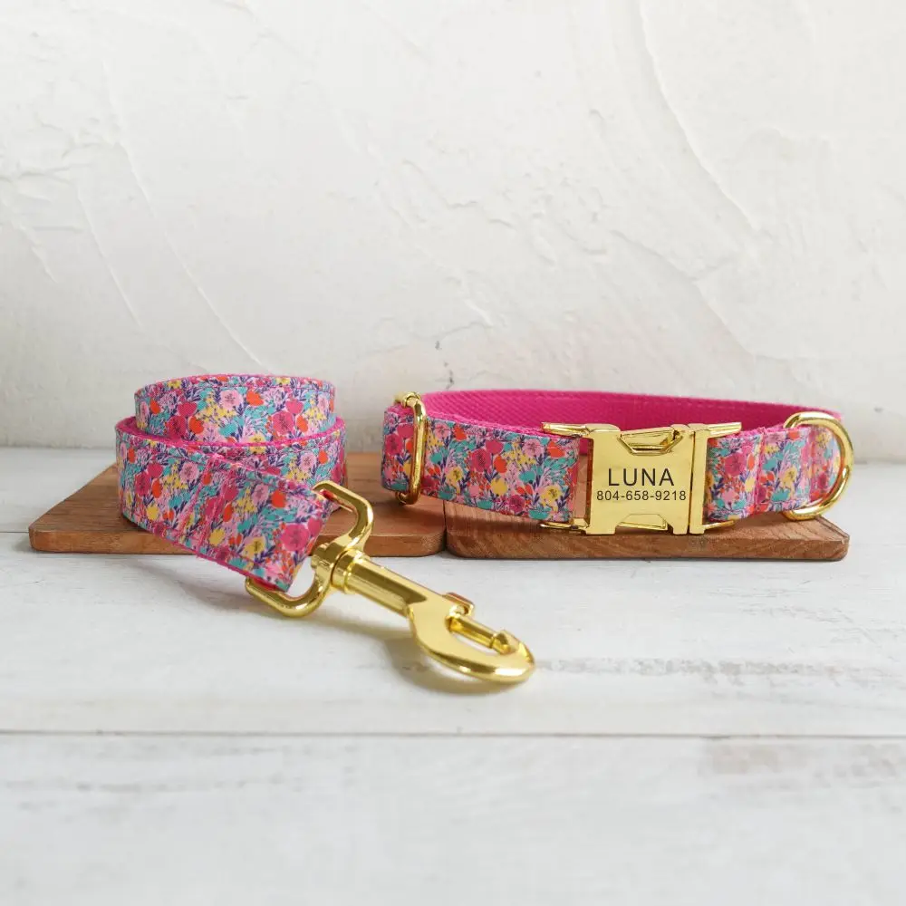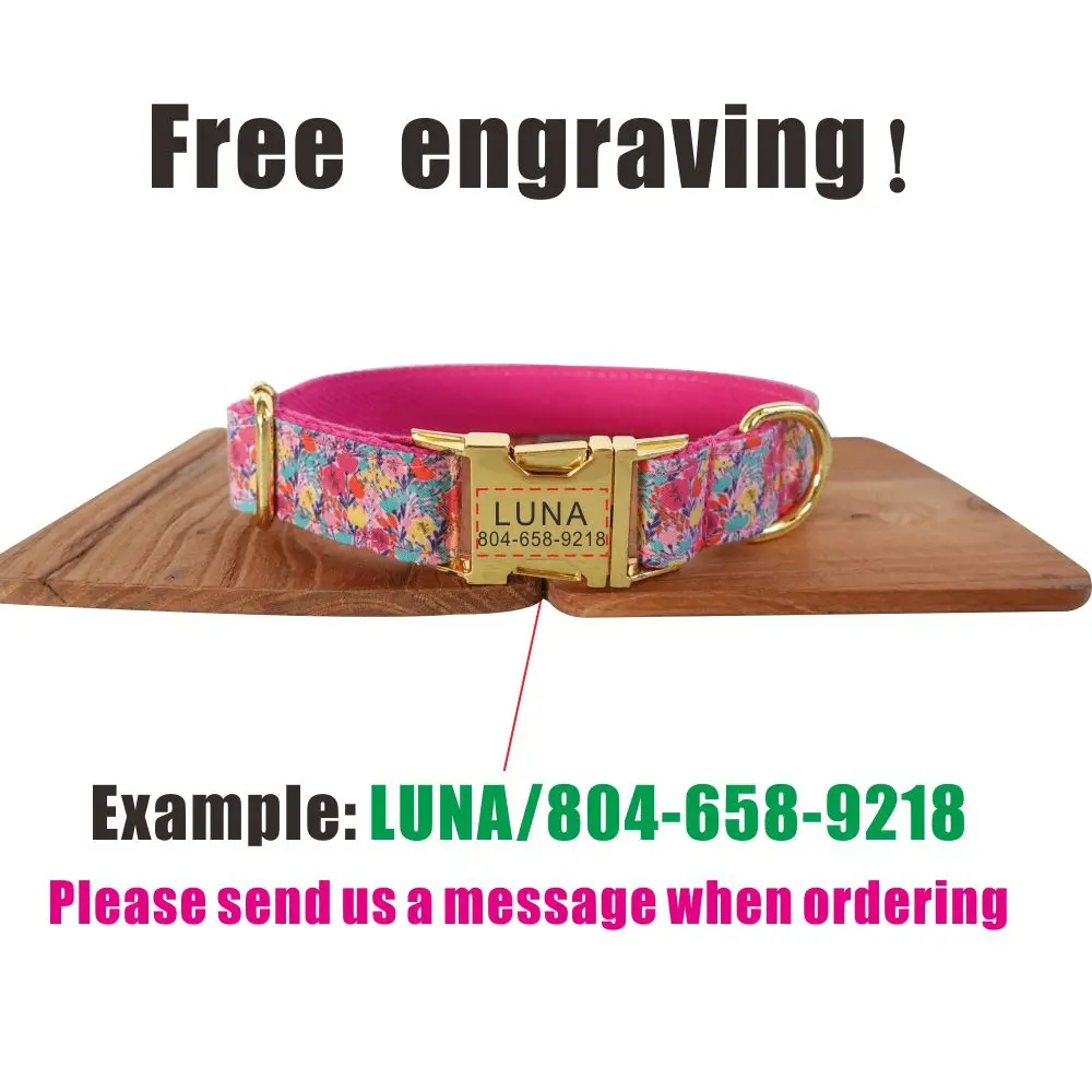 Nombre del producto: Collar personalizado para perros Collar personalizado para mascotas Grabado gratuito Etiqueta de nombre de identificación Accesorio para mascotas Juego de correa de collar de fibra para cachorros de flores rosas