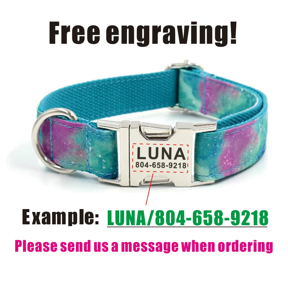Nombre del producto: Collar personalizado para perro, placa con nombre personalizada para cachorro, etiqueta de identificación, hebilla fuerte ajustable, estrellas galaxia, collares básicos para mascotas, juego de correa de plomo
