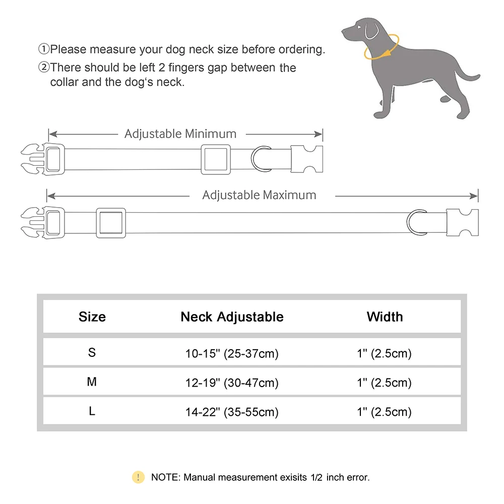 Hermoso collar, hermoso color y hermoso escritura. Un poco decepcionado, a pesar de haber elegido el tamaño correcto del collar, dada la ubicación de la escritura durante el ajuste, una parte está oculta por el plástico.