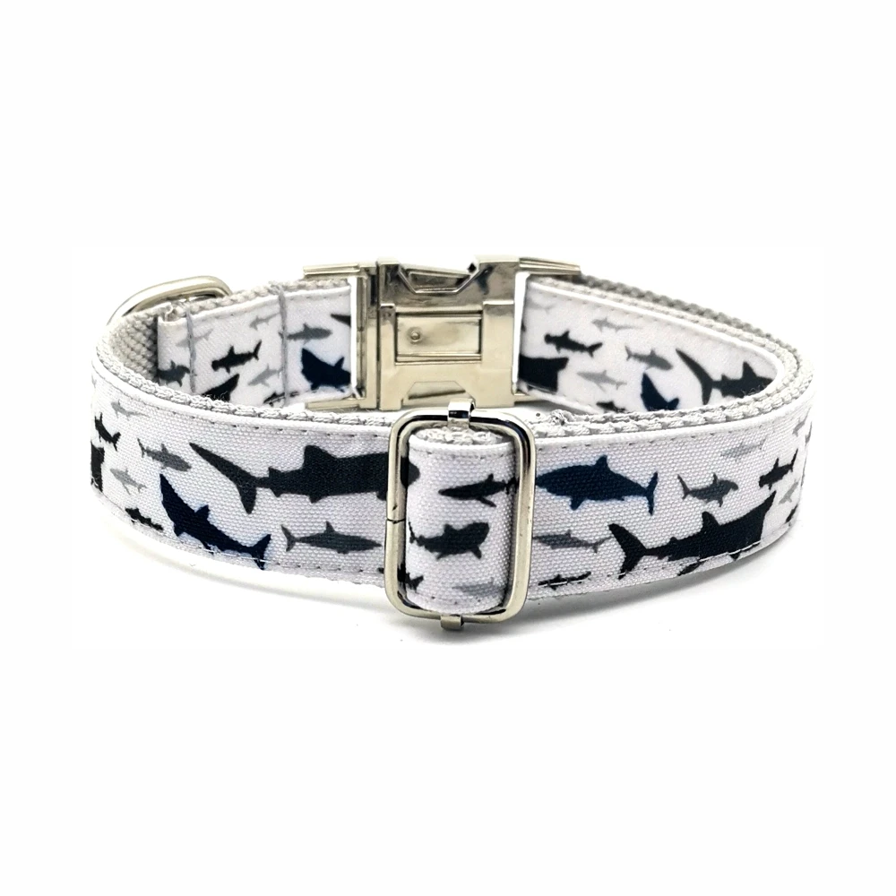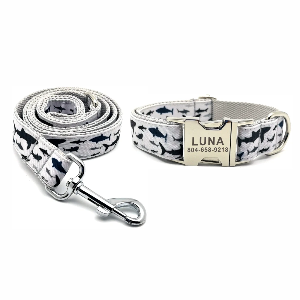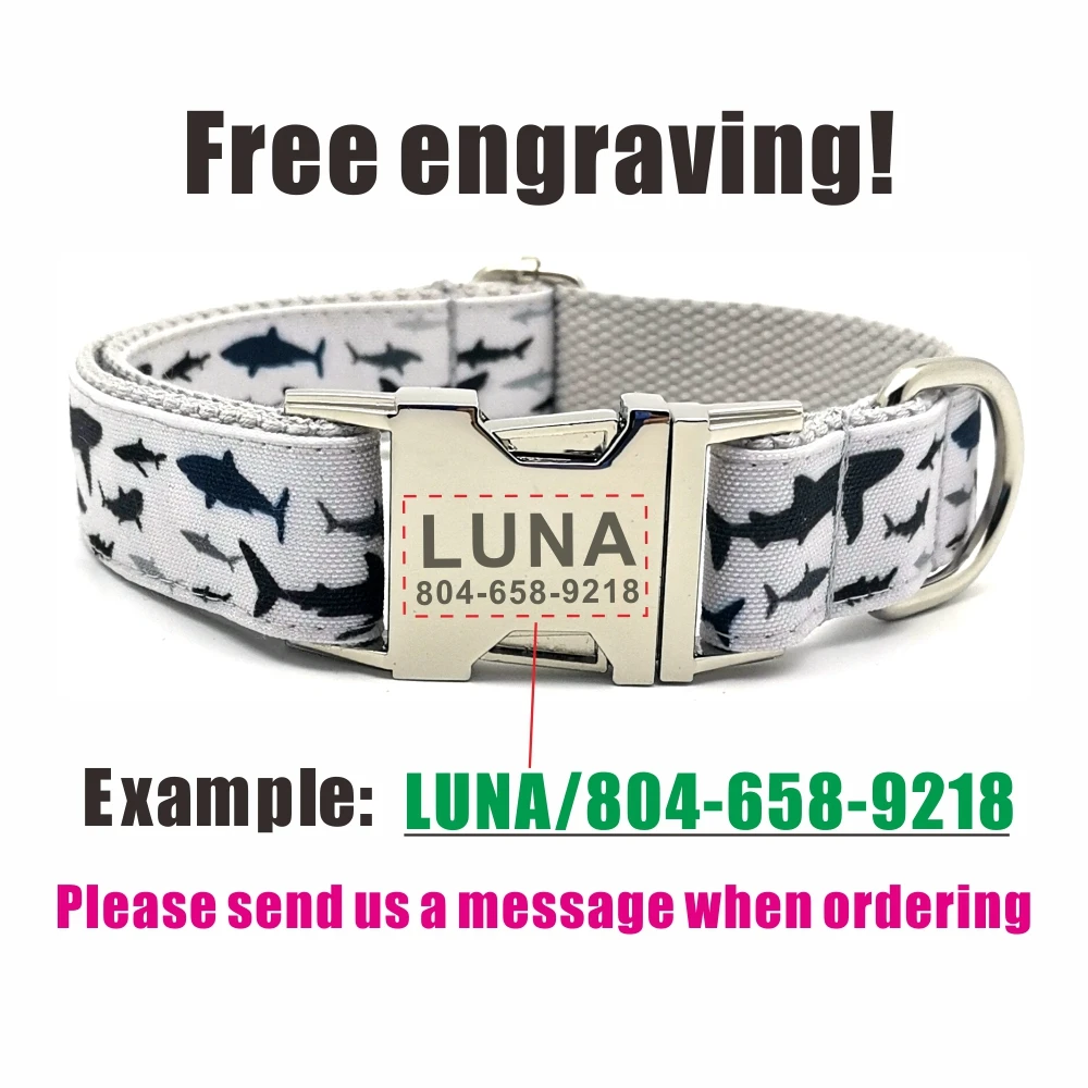 Nombre del producto: Collar personalizado para mascotas, pez de mar, duradero, personalizado, nombre de cachorro, etiqueta de identificación, ajustable, grandes, pequeños tiburones, gris, básico, collares de perro, conjunto de correa