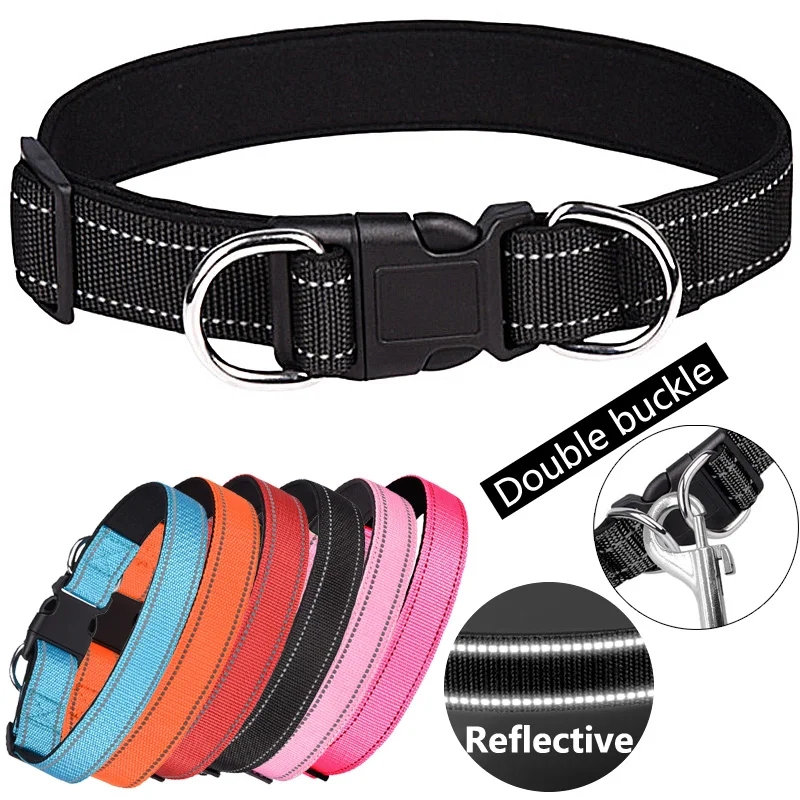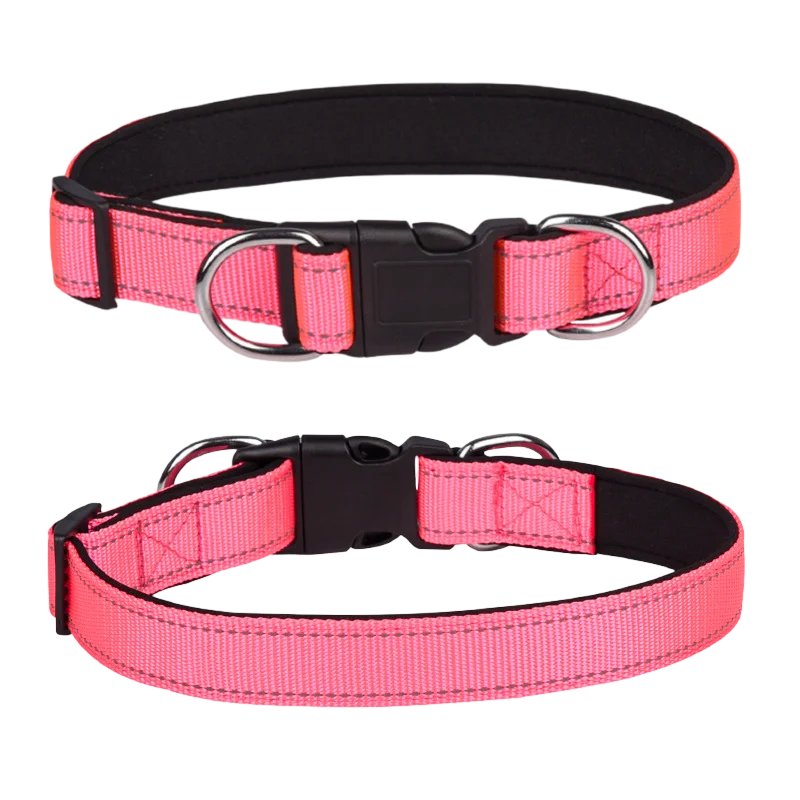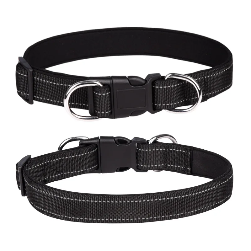 El diseño de anillos en D dobles es elegante y práctico.Este diseño no sólo evita que el collar se caiga sino que también brinda a las personas una sensación de seguridad y confiabilidad.Por la noche, las tiras reflectantes mejoran enormemente la seguridad de los propietarios y peatones para evitar accidentes de forma eficaz.