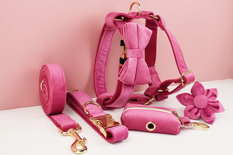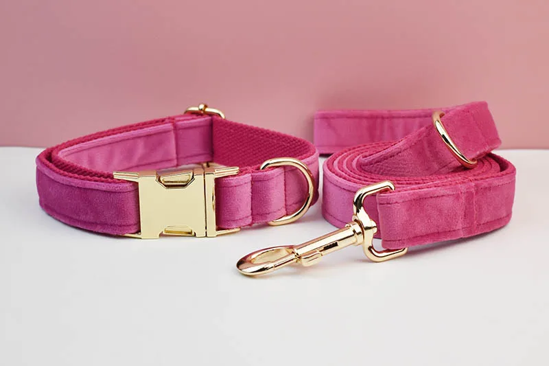Collar y correa de perro de terciopelo rojo rosa para perros, placa de identificación grabada personalizada, suministros para mascotas, correa de perro de terciopelo 23