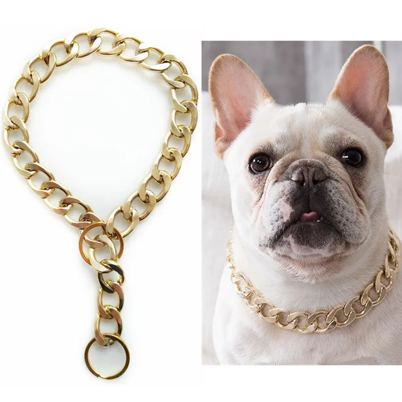 Metal Dog Training Collars Luxury Pet Dog Collar Gold Chain Necklace For Bulldog Small Medium Dogs Cat Costume Accessories Features: 1.Pet collar: Excellent dog chain with metal touch is very suitable for daily walking and taking cool photos. 2.Suitable for cats, small dogs and medium dogs. 3.The dog collar is safe, polished, smooth, comfortable and does not stain the dog. 4.Fashionable coolness: Dog collars can dress up dogs and make them fashionable. 5.Multiple sizes are optional, select the right size for measurement. Specification: Product Name: Gold Pet Collar Material: Gold plated metal S: Length 35cm/13.8in, suitable for neck circumference within 30cm/11.8in M: Length 45cm/17.7in, suitable for neck circumference within 40cm/15.7in L: Length 55cm/21.7in, suitable for neck circumference within 50cm/19.7in Suitable for: cats and small and medium dogs