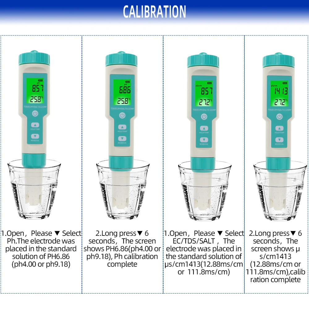 Conductividad de calibración EC: Admite identificación automática de calibración de 3 puntos (1413us 12.88 ms y 111.8 ms) con 3 puntos de calibración (1413 uS/cm 12.88mS/CM 111.8mS/CM) pH: 1 punto (6.86) o 2 puntos (6.86 4.00) ) (6.86 9.18) o 3 puntos (6.86 4.00 9.18) puede identificar automáticamente la solución de calibración