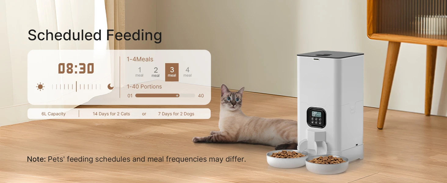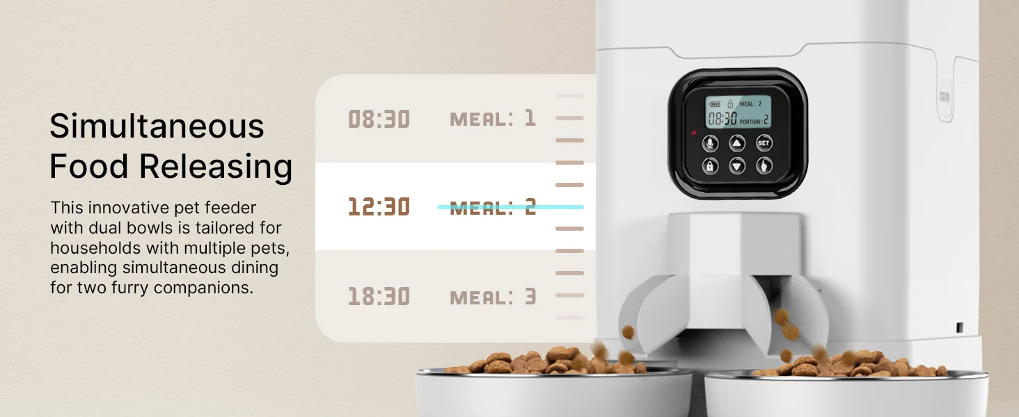 • Porciones de comida iguales y precisas: este comedero para mascotas distribuye automáticamente cantidades iguales de comida para garantizar que ambos gatos obtengan el mismo tamaño de comida;El dispensador tiene una capacidad de 6 litros y se pueden preparar hasta 4 comidas al día donde cada comida puede preparar hasta 40 porciones (1 ración – 0.264 onzas)