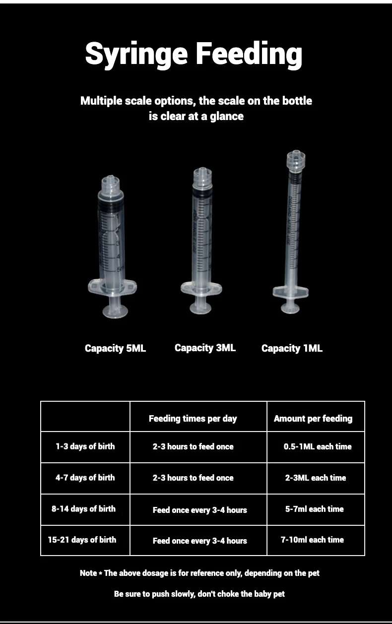 🌟 2. Alimentación estilo jeringa:El diseño de la jeringa permite una alimentación precisa, presentando múltiples marcas de medición en la botella para una dosificación fácil y precisa.Puede controlar fácilmente cuánta leche recibe su mascota.