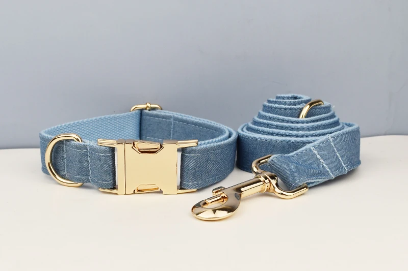 Diseño personalizado de alta calidad Logo azul denim algodón suave accesorios para mascotas Collar de perro personalizado correas arnés arco conjunto
