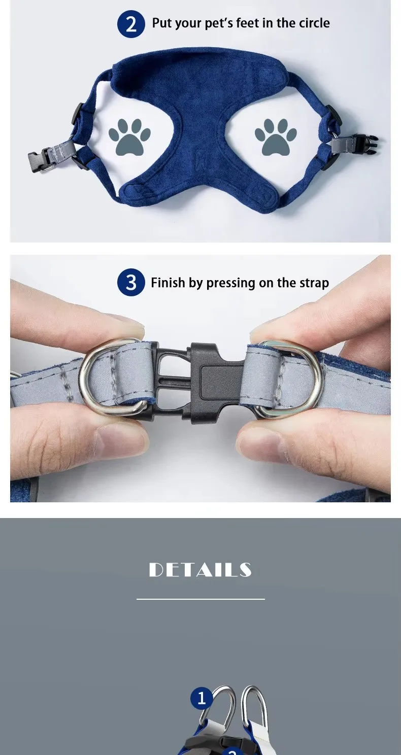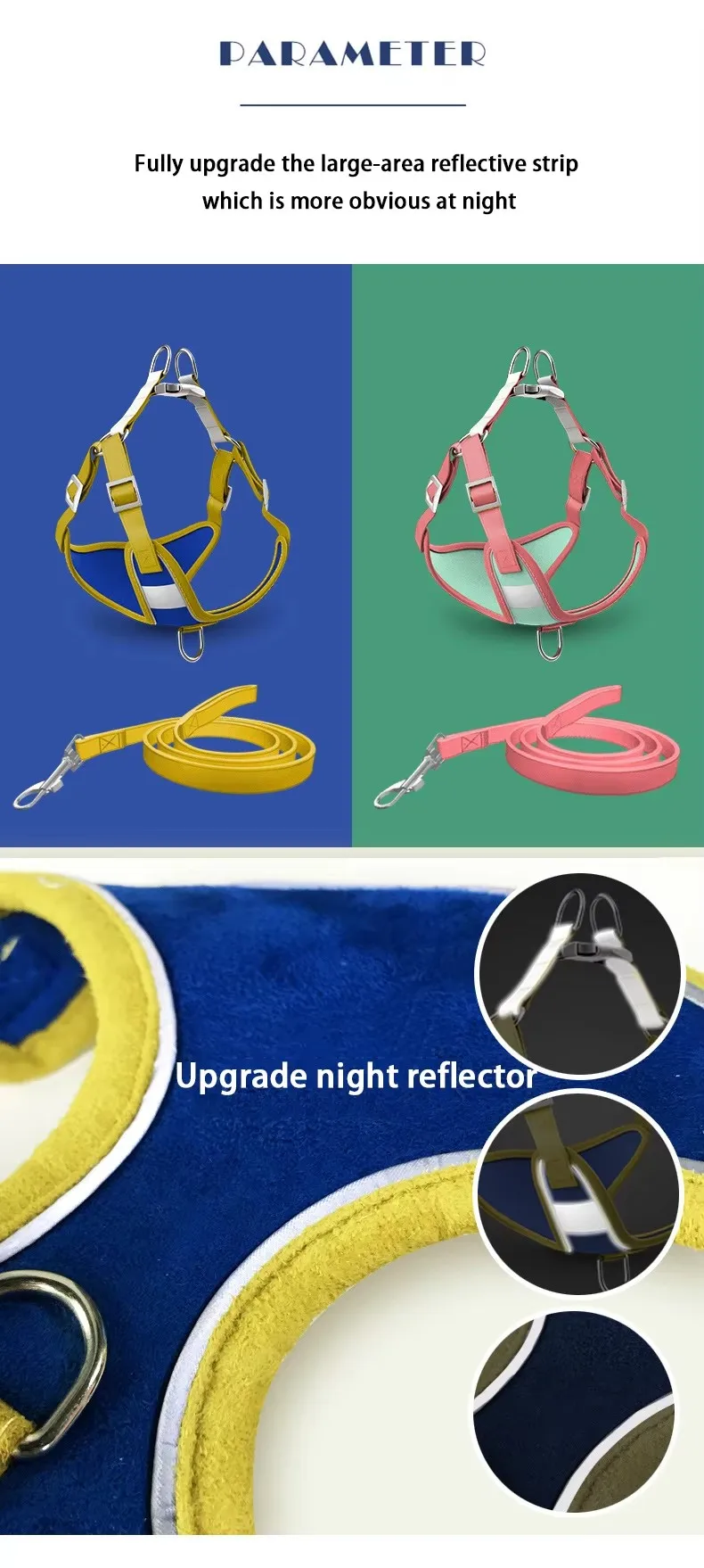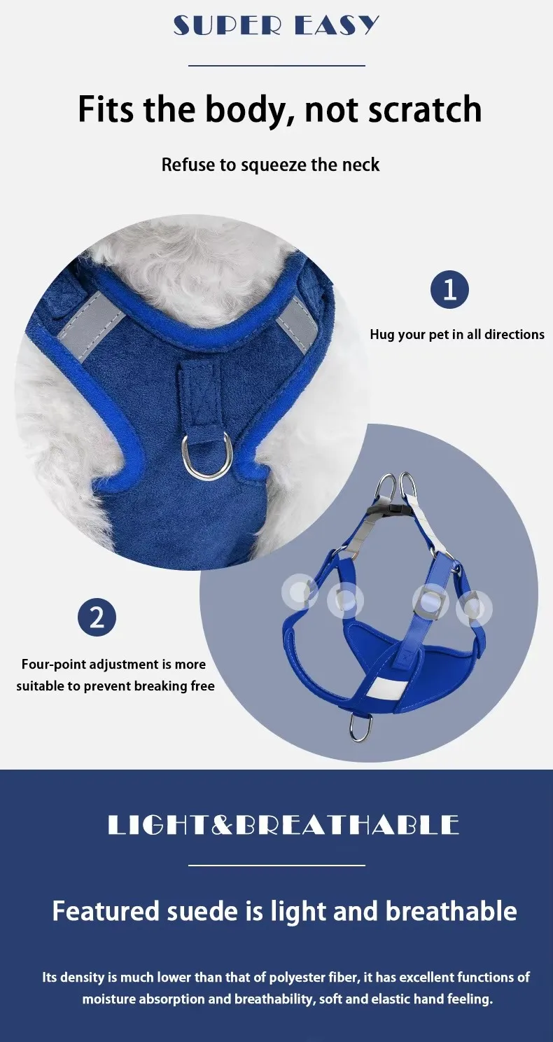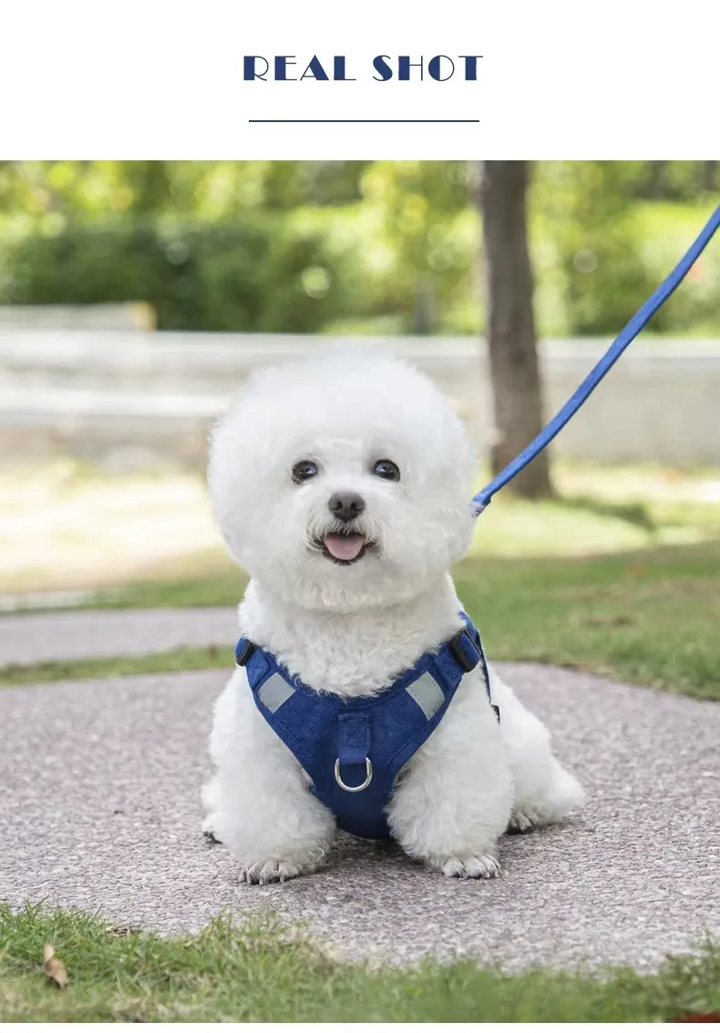 Conjunto de arnés y correa para perros estilo chaleco reflectante de gamuza, arnés ajustable para cachorros a prueba de escape para perros pequeños, aliento acolchado suave
