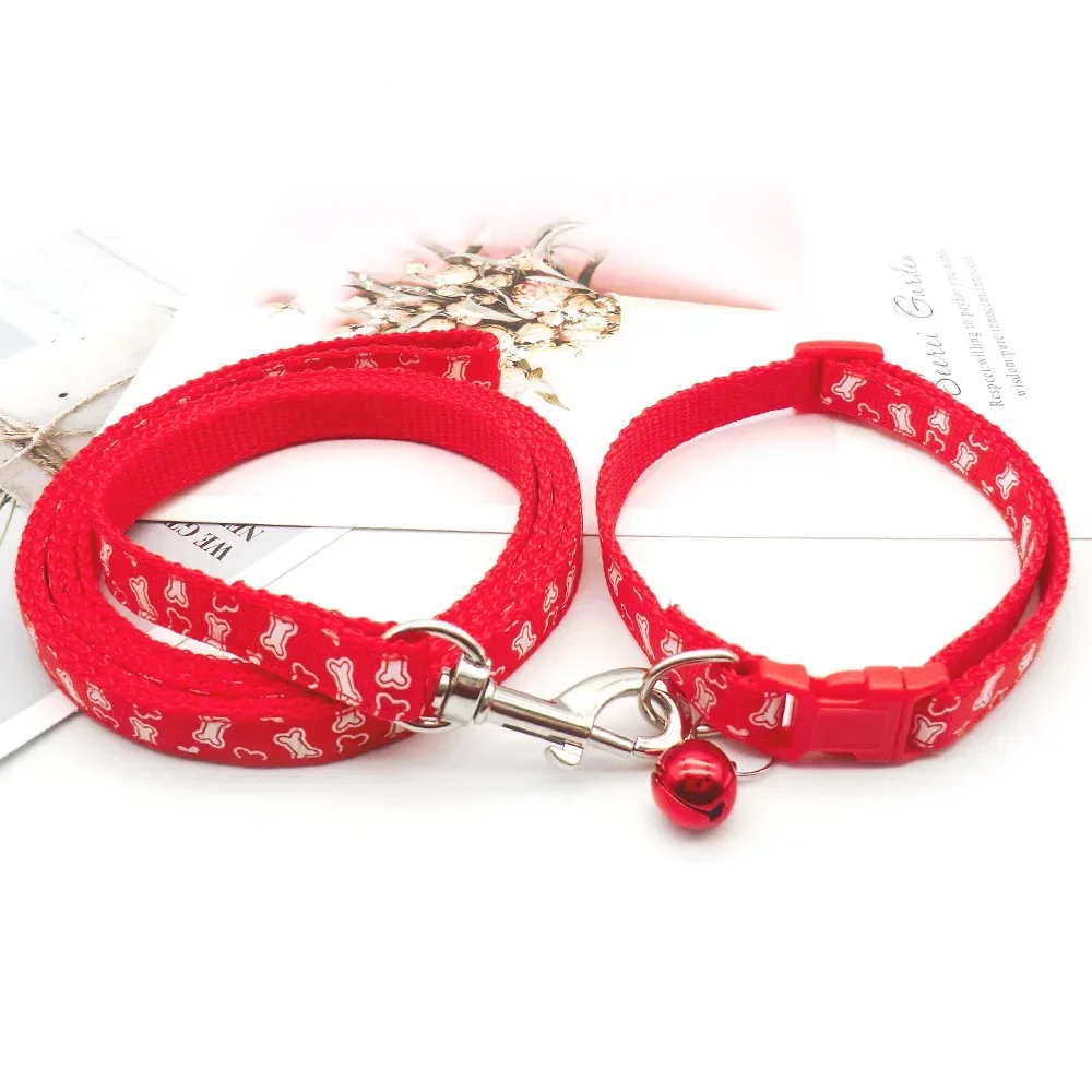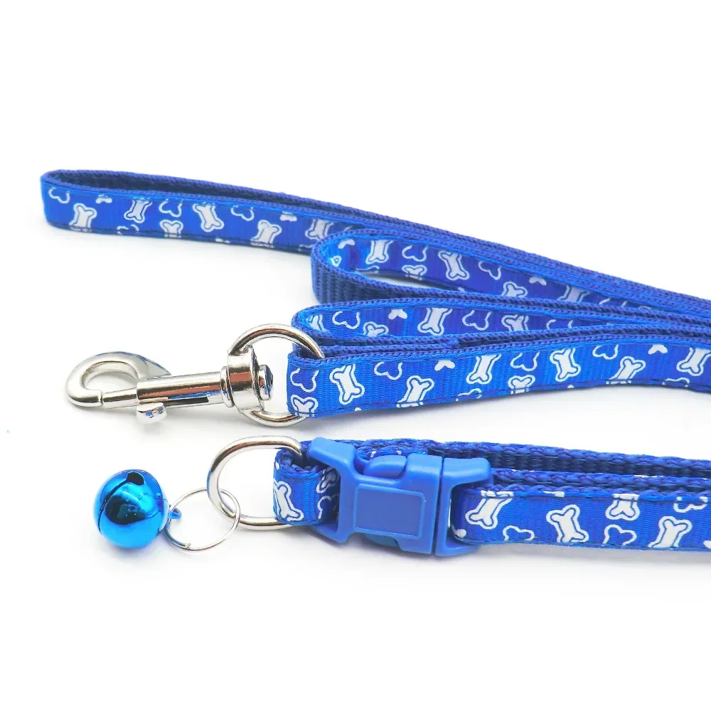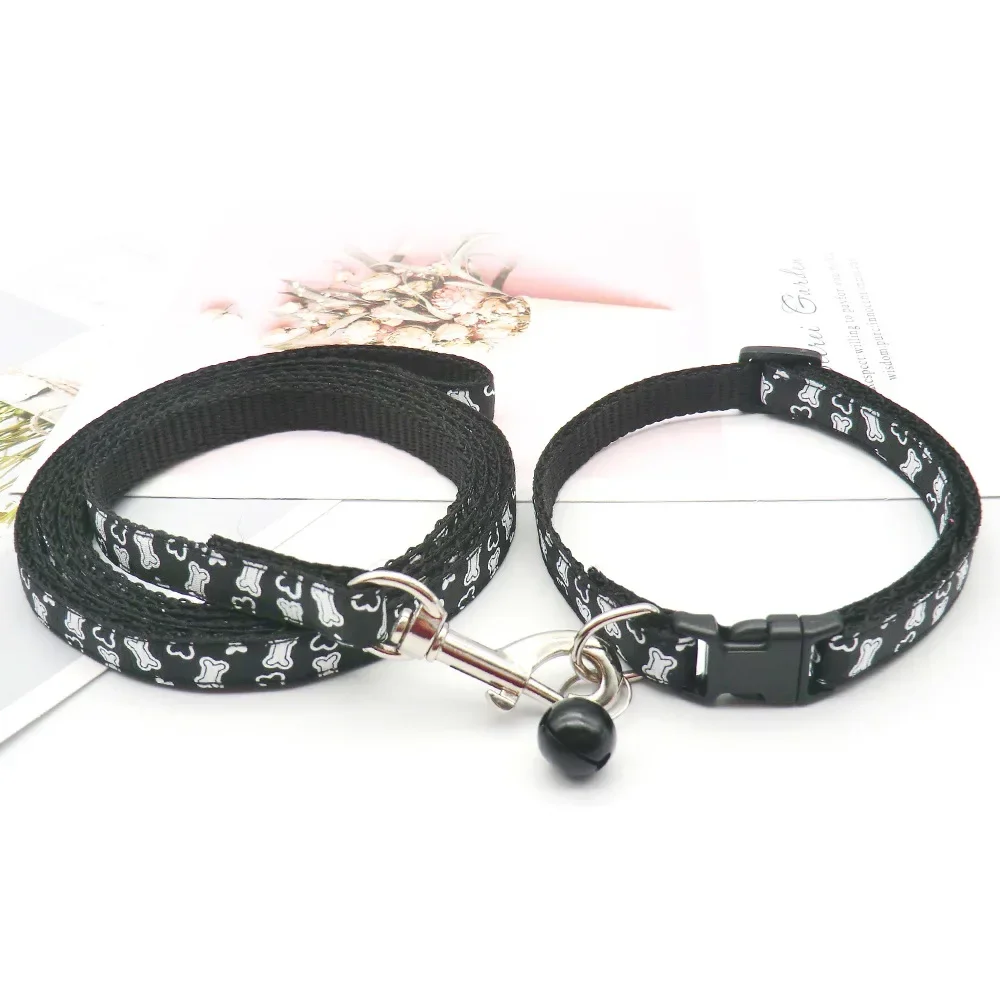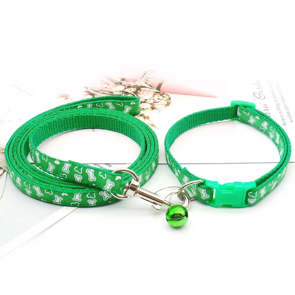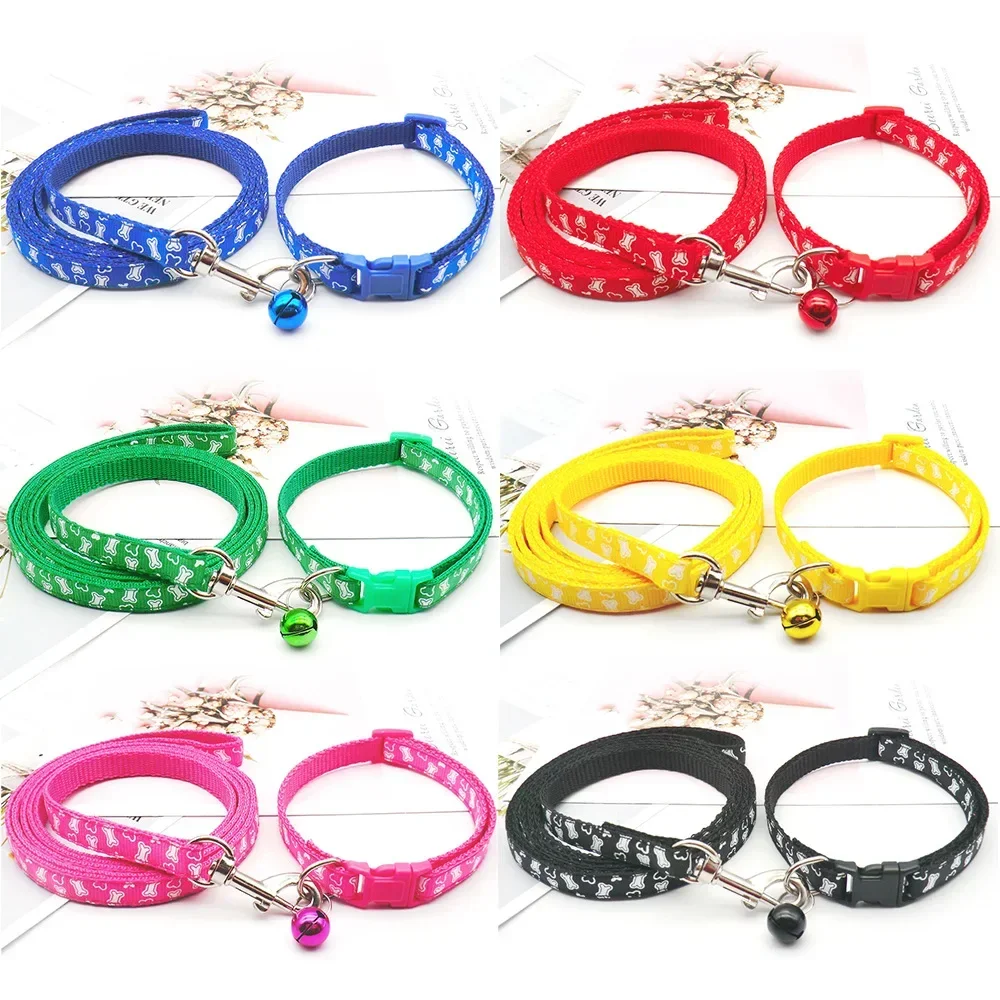 Conjunto de Collar de gatito colorido con estampado de huesos, hebilla ajustable, campana y correa, accesorios para mascotas, suministros para caminar para mascotas