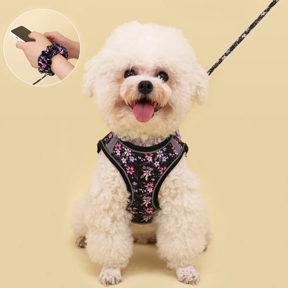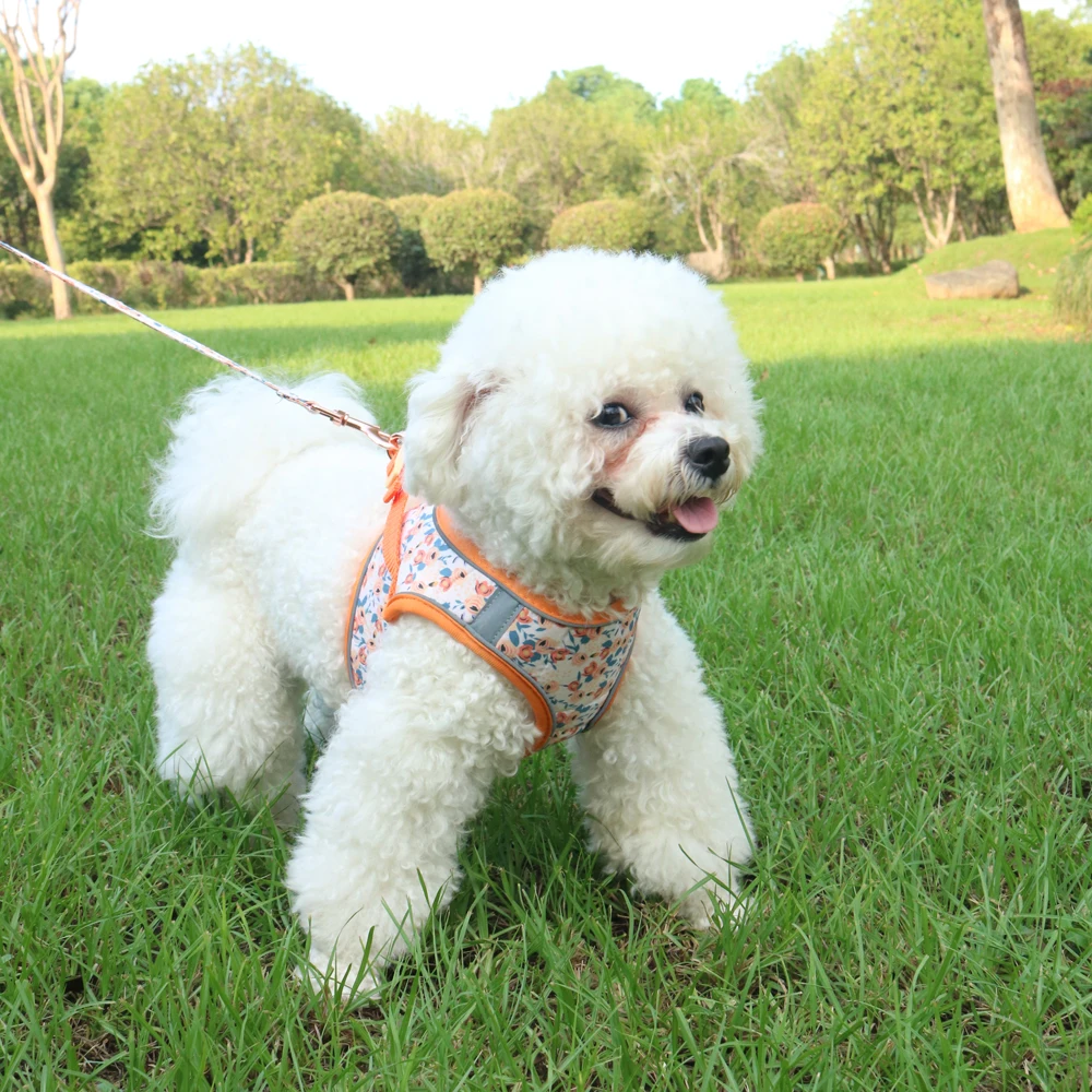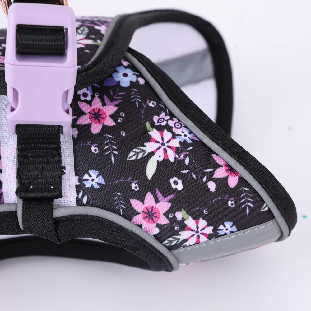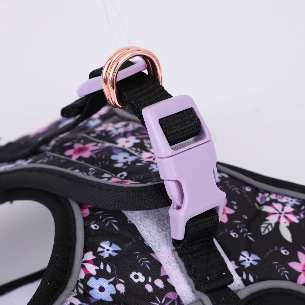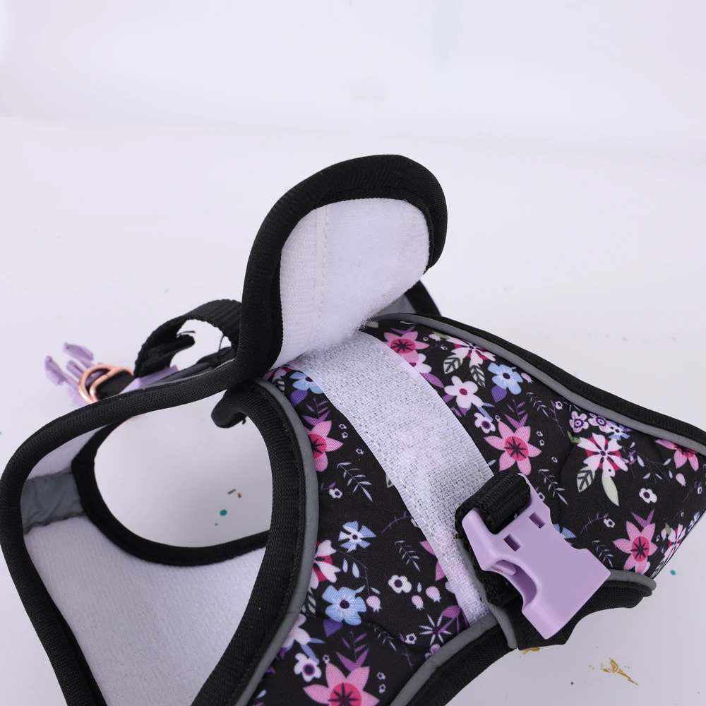 1.Arnés estampado, estilo novedoso, cálido y transpirable, con función reflectante nocturna, gancho de doble anillo en D más firme.