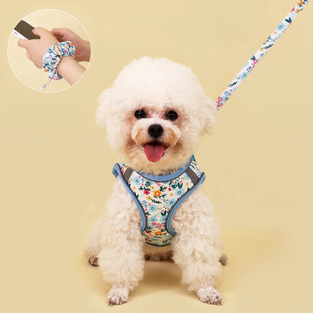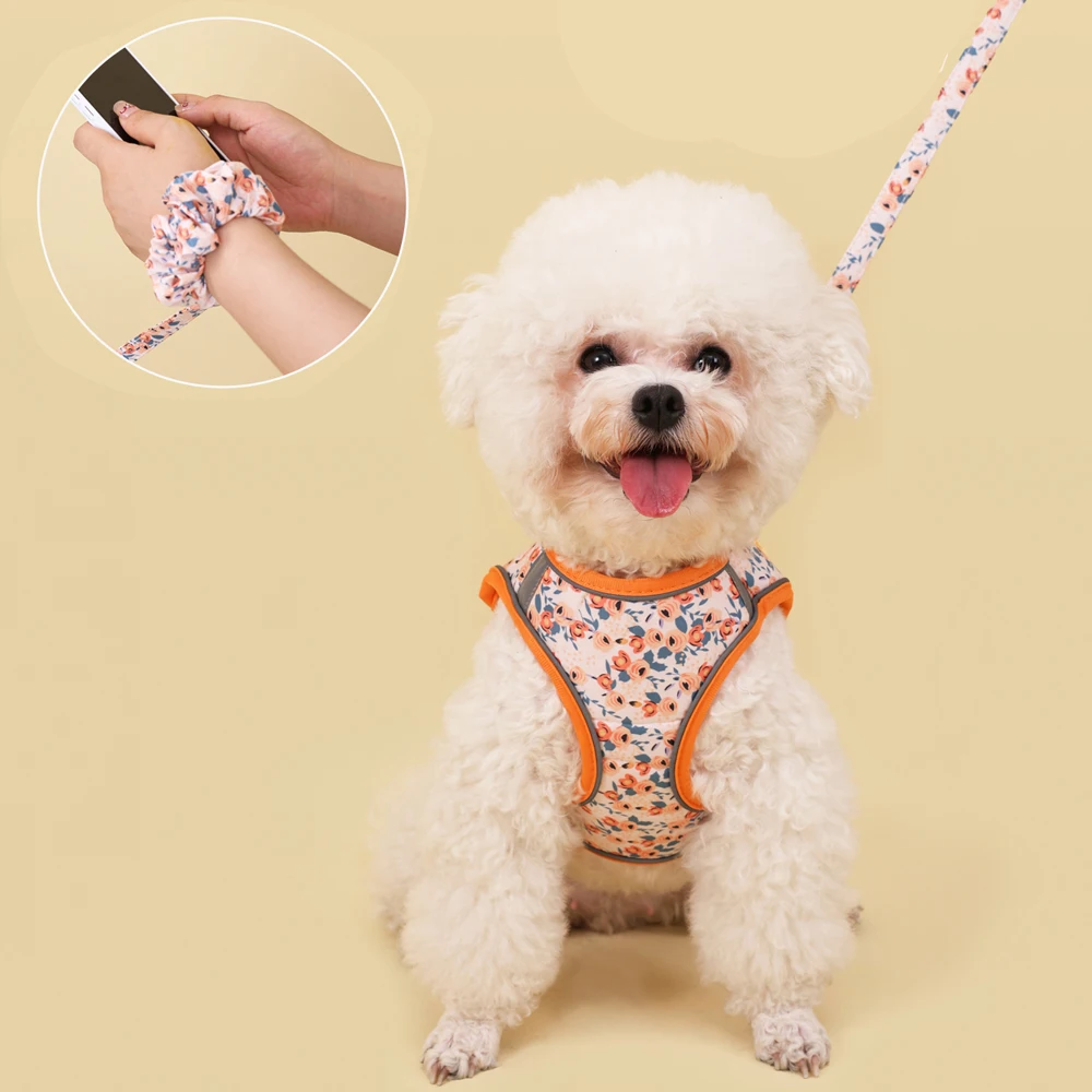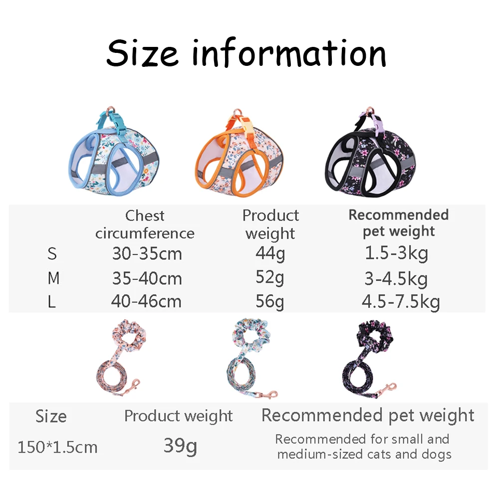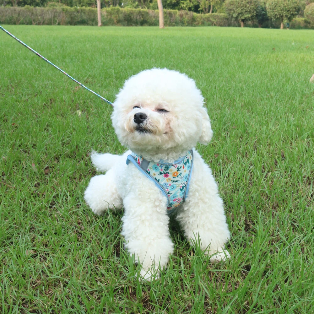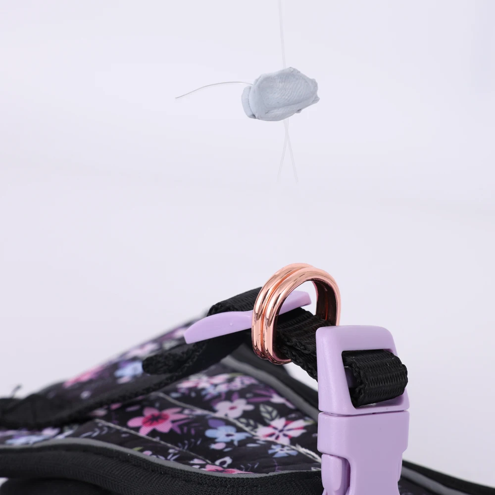 1.Arnés estampado, estilo novedoso, cálido y transpirable, con función reflectante nocturna, gancho de doble anillo en D más firme.