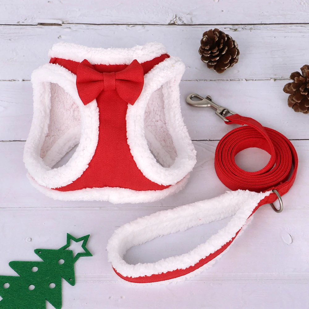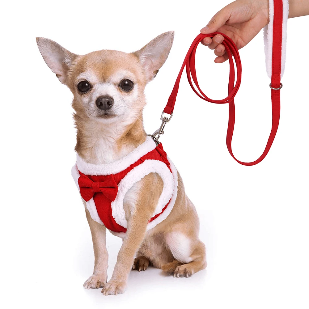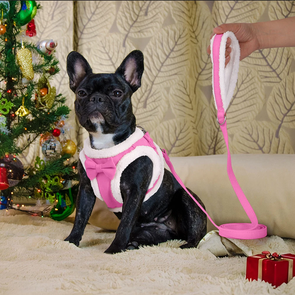 Tipo:Arnés cálido de invierno para perros, conjunto de correa, arnés de lana suave para mascotas, chaleco con linda pajarita para perros pequeños y medianos, cinturón para caminar Chihuahua