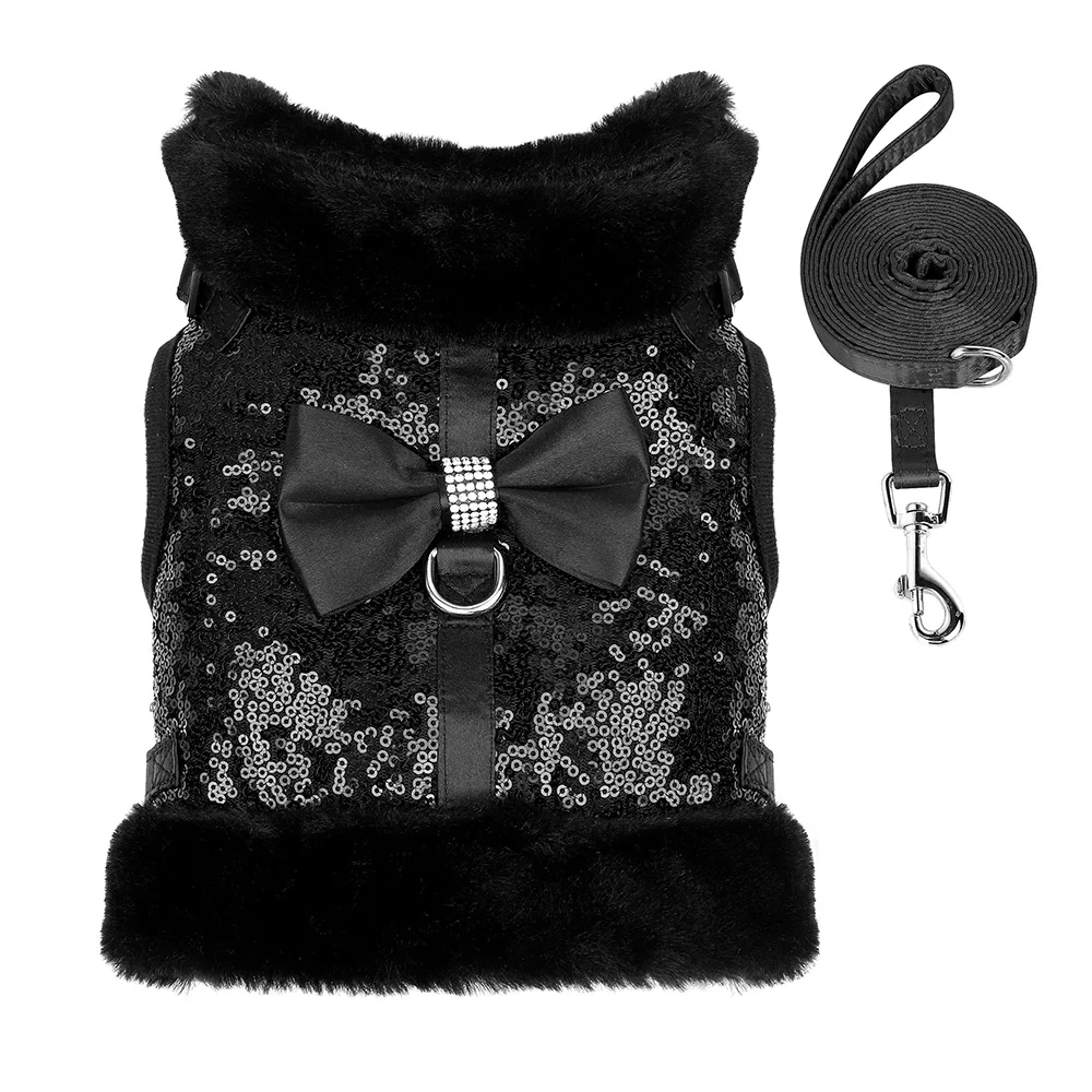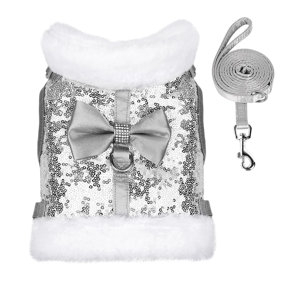 Arnés de invierno para perros, conjunto de correas, arneses cálidos para cachorros y gatos con Collar de piel, chalecos con lentejuelas ostentosas para mascotas para perros y gatos, accesorios con lazo