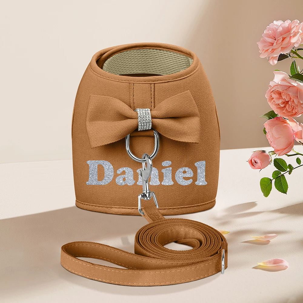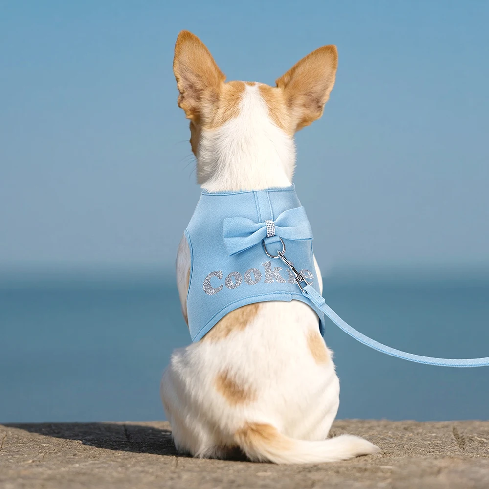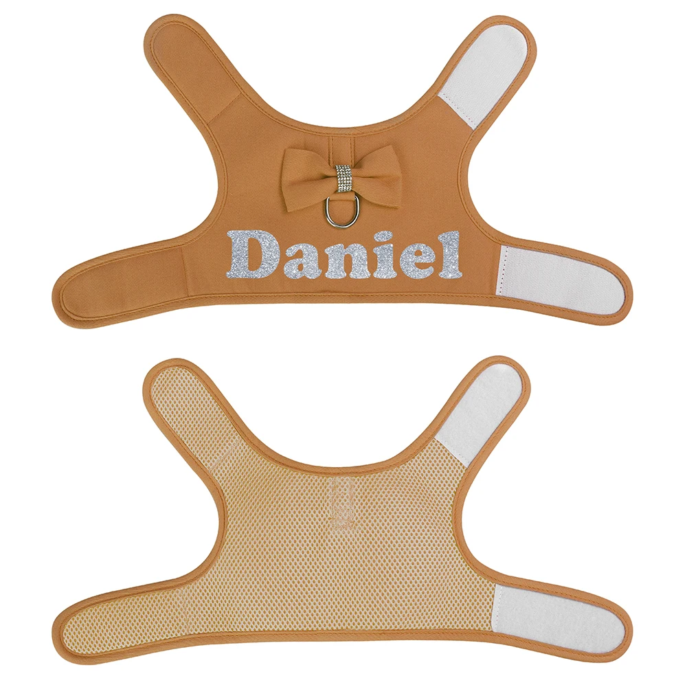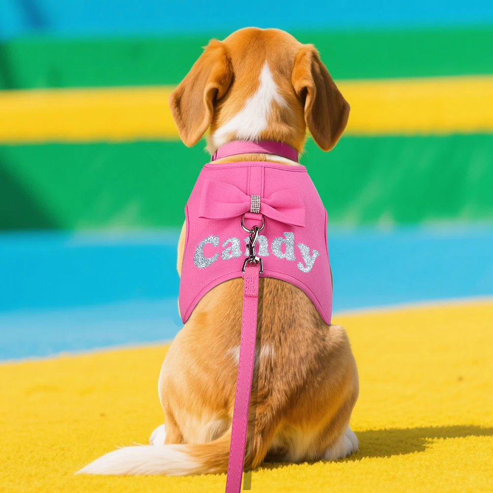 Arnés personalizado para perros, conjunto de correas de malla transpirable para perros con bonito lazo, chaleco con nombre de mascota para perros pequeños y medianos, SchnauzerColores:Rosa, morado, rosa, marrón, azul.