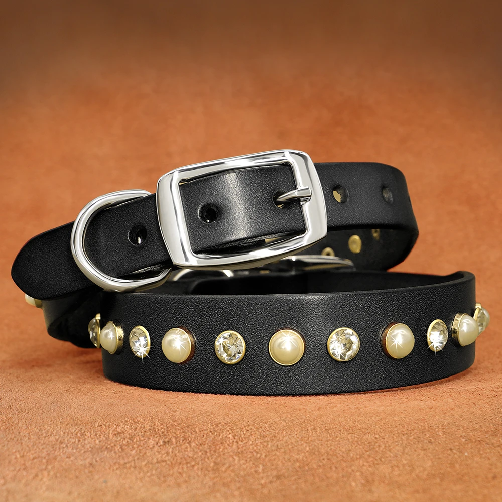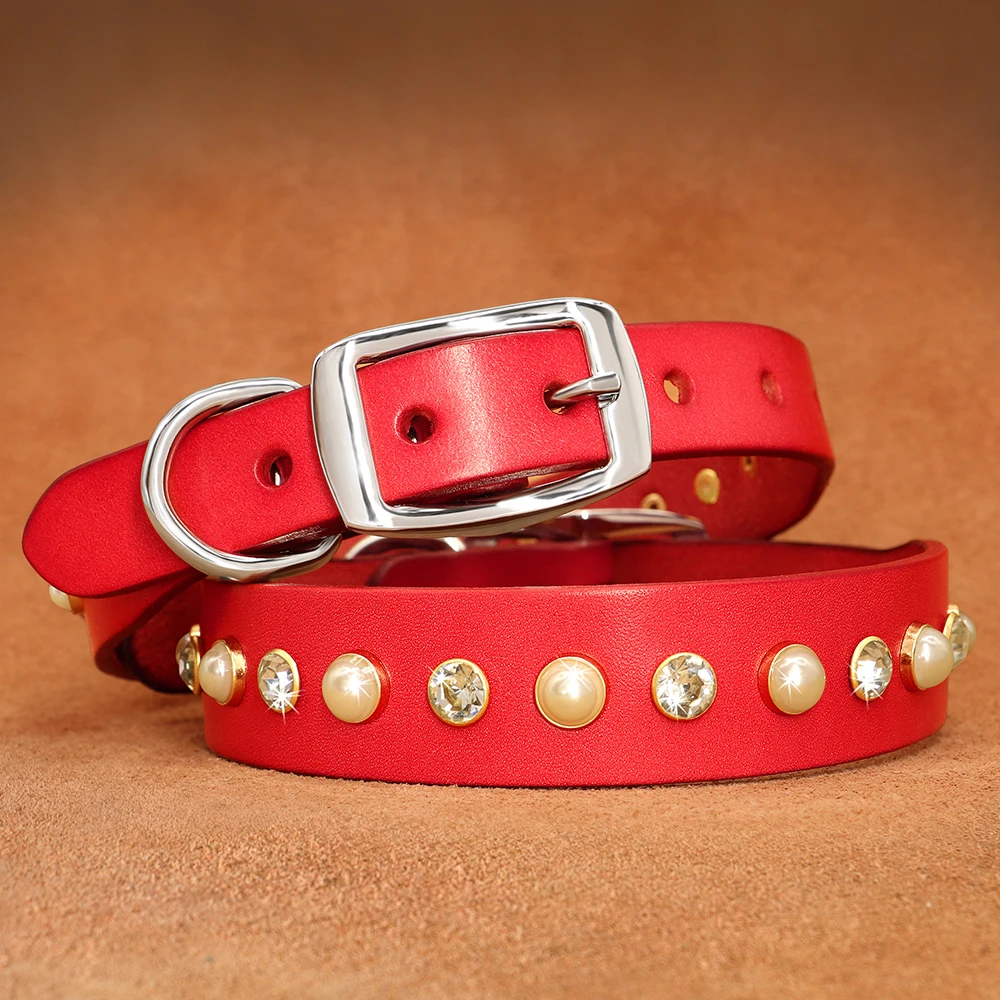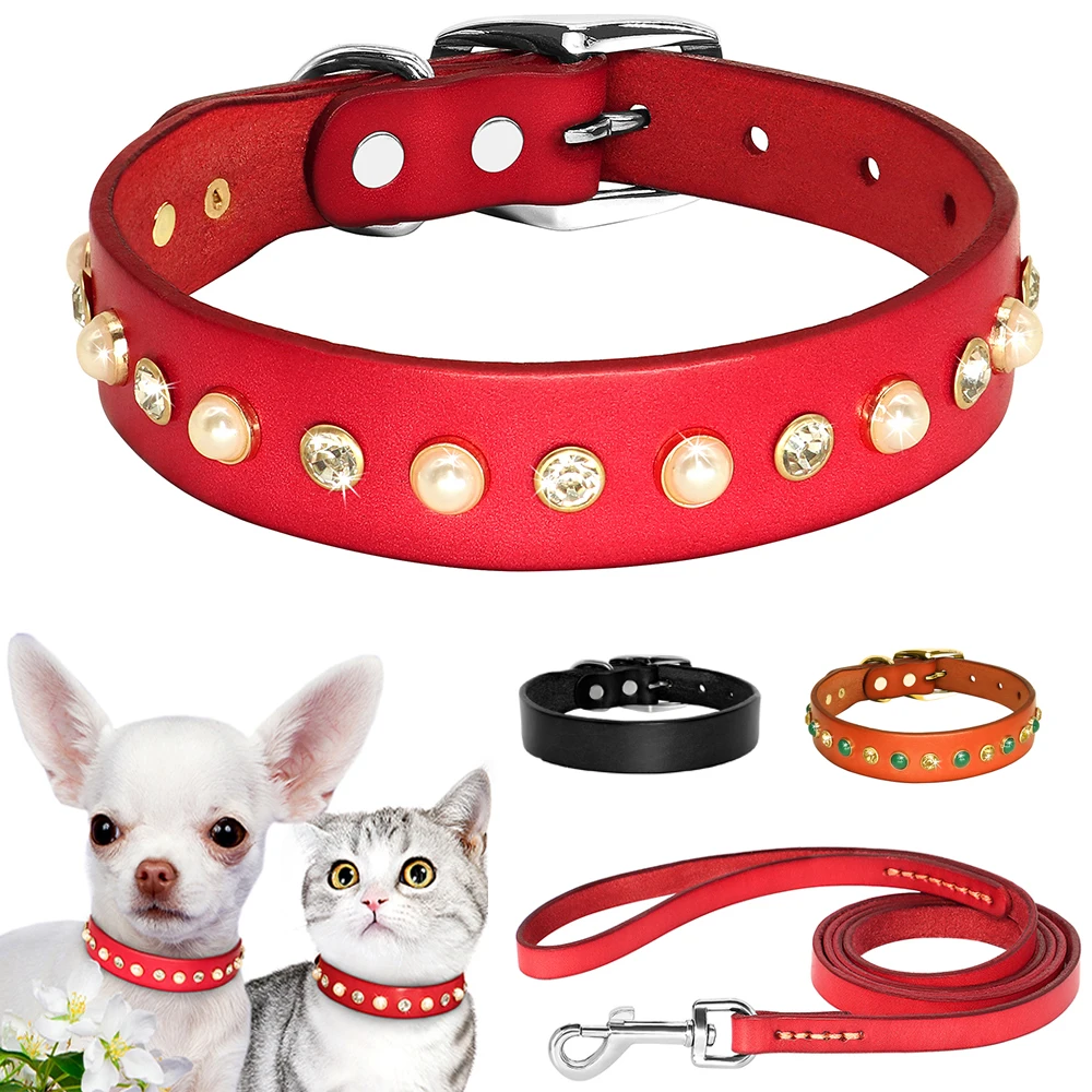 Conjunto de Collar de correa de perro de cuero genuino con diamantes de imitación para cachorros y gatos, Collar de perlas de diamante para mascotas con plomo para perros Chihuahua