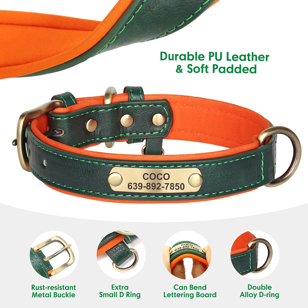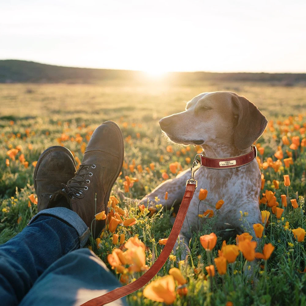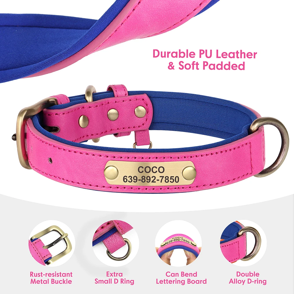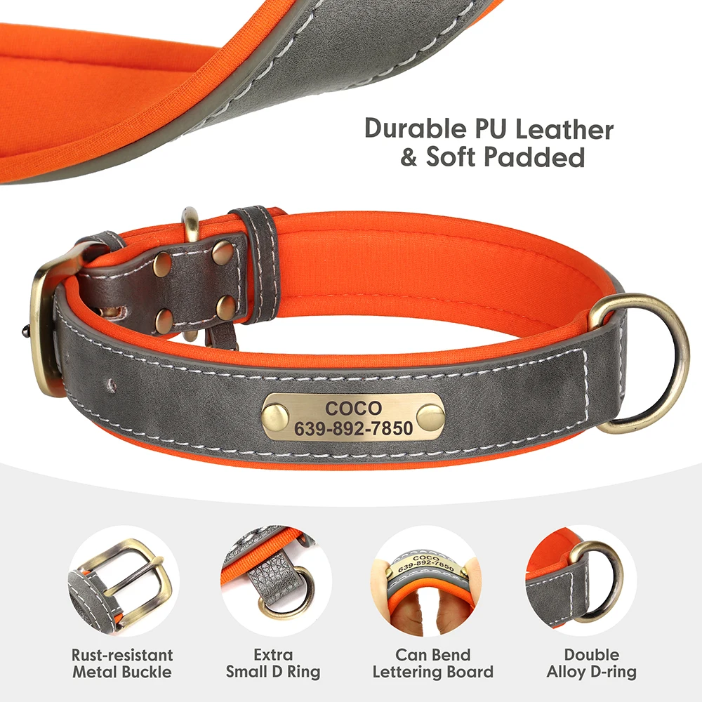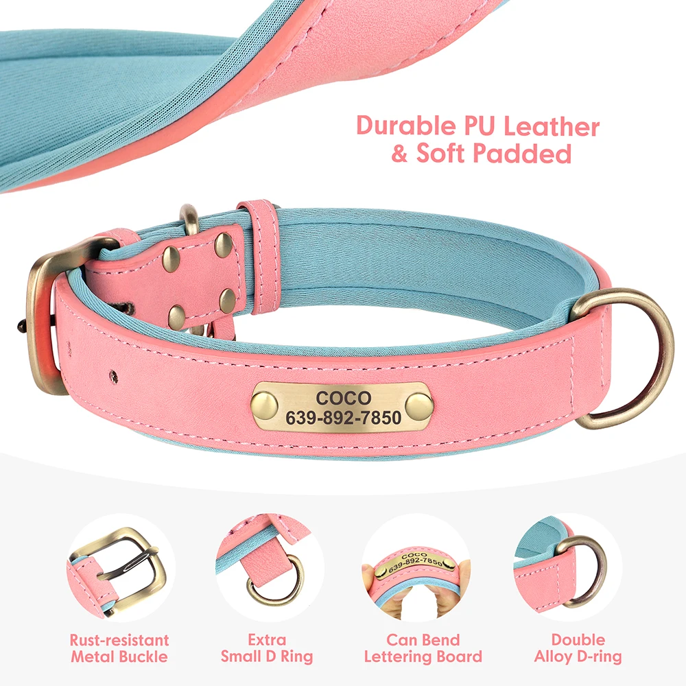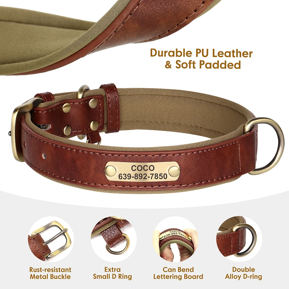 Nombre: conjunto de correa de cuero personalizado para perros, collares acolchados suaves con cuerda de plomo para caminar para mascotas, para perros pequeños, medianos y grandes, Pug