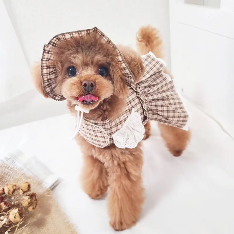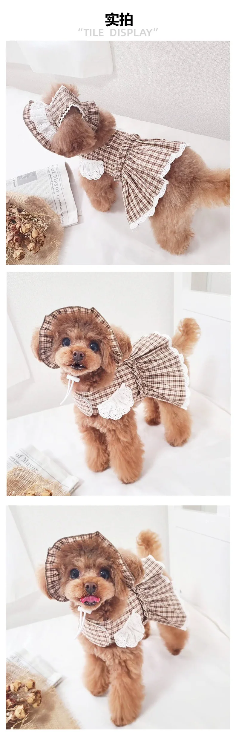 Conjunto de tracción a cuadros para mascotas, vestido con sombrero, princesa a cuadros, cumpleaños, caminar, salir de perros para fotos, conjunto de arnés y correa