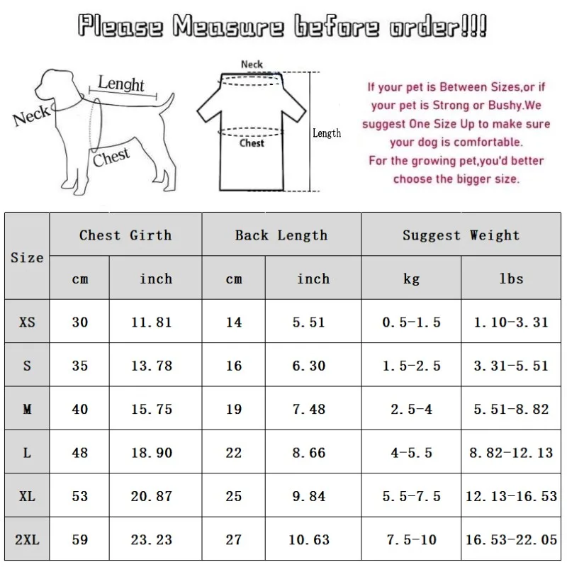 2XL: Pecho 59cm/23,23''; Longitud 27 cm/10,63 pulgadas; Peso sugerido 7,5-10 kg/16,5-22,05 libras.