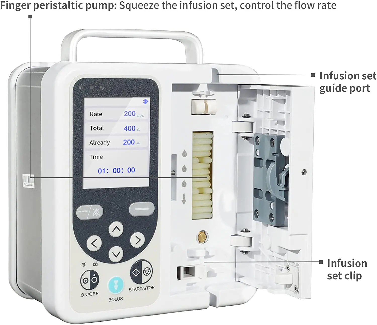 ◆ El detector de burbujas de aire de alta precisión evita que las burbujas de aire entren en el cuerpo del paciente.