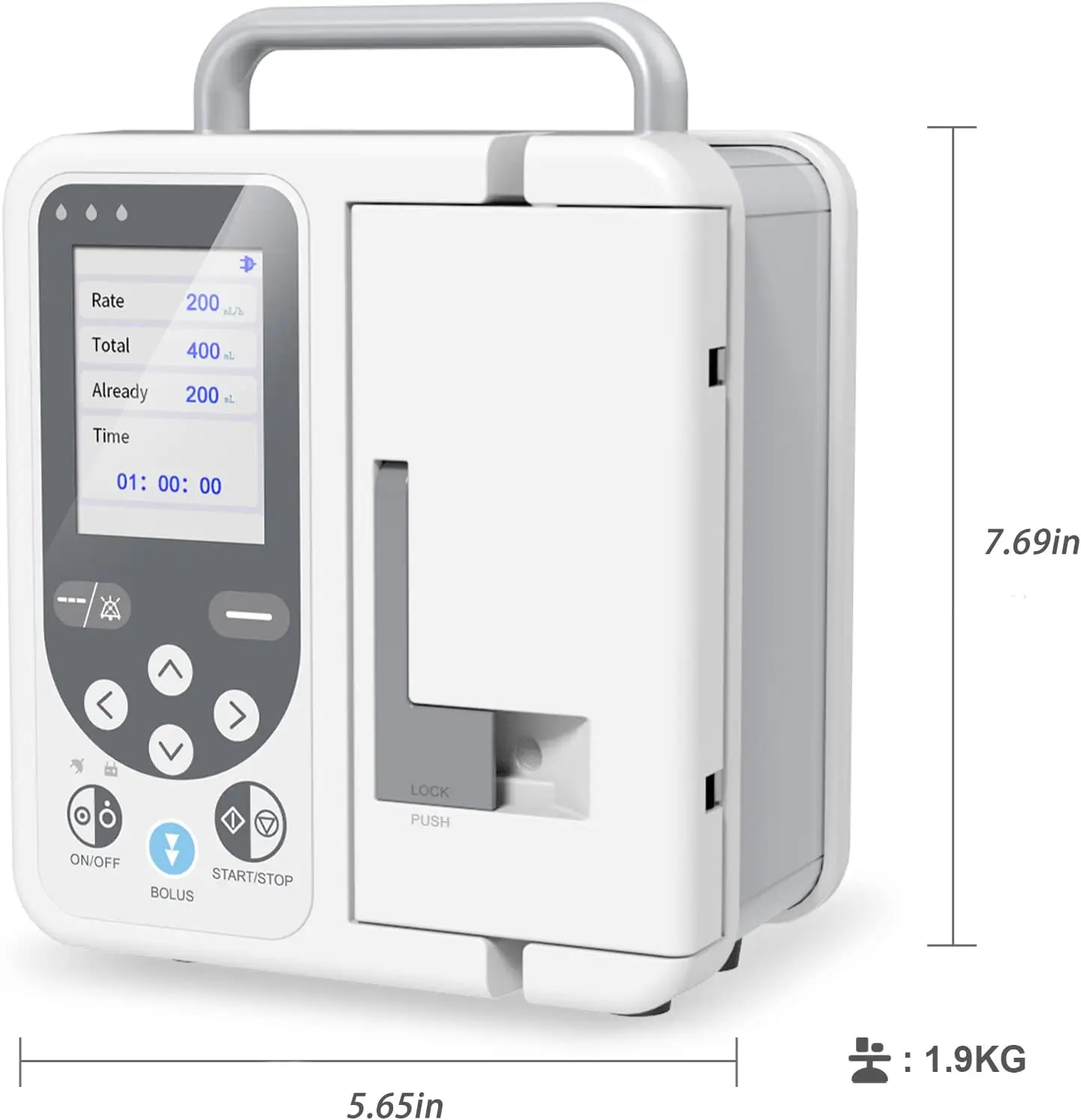 ◆ Funciones de alarma: extremo cercano, estado KVO, batería baja, sin energía, fallo de presión, fallo de puerta, burbuja de aire, puerta abierta, oclusión, recordatorio de infusión, fallo de comunicación y fallo del motor.