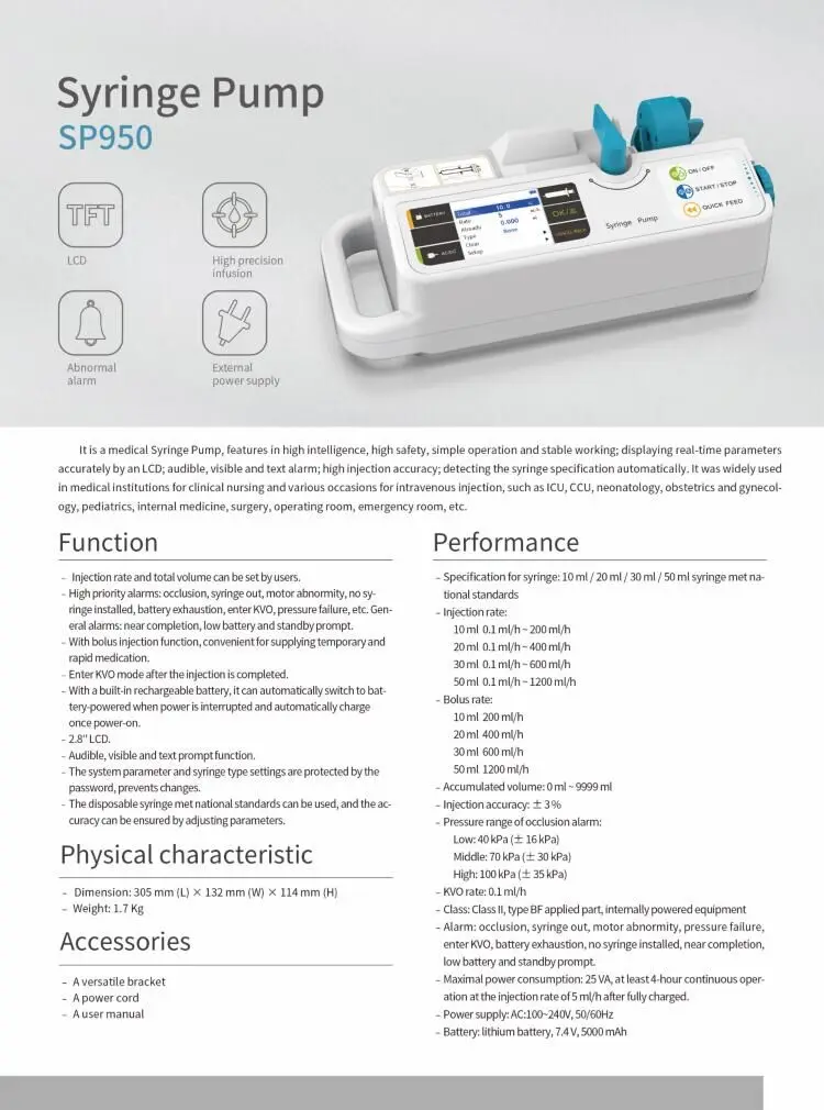 IntroducciónSP950 es una bomba de jeringa para uso médico veterinario, y adopta un sistema de microcomputadora y Tecnología Microelectrónica, características de alta inteligencia y alta seguridad. LCD puede mostrar cada parámetro en tiempo real, con alarma multifunción y alarma con aviso visual, auditivo y de carácter. Aprovecha las ventajas de una operación fácil, trabajo constante, alta precisión y verificación de las especificaciones de la jeringa automáticamente. Y ahora, se ha aplicado ampliamente en cada inyección de vena en hospitales para enfermería clínica, como UCI, CCU, neonatología, obstetricia y ginecología, pediatría, medicina interna, cirugía, quirófano, sala de urgencias.Características1) La velocidad de infusión y el volumen total pueden ser establecidos por el usuario.2) Alarmas para oclusión de tubería de infusión, caída de jeringa, comunicación anormal, batería baja.3) El volumen de la alarma y el rango de la alarma de presión son ajustables.4) Función de alimentación rápida, conveniente para suministrar medicamentos de forma rápida e instantánea.5) Entra en modo KVO después de completar la infusión.6) El sistema dará una señal rápida cuando no haya operación en estado de encendido.7) La batería recargable incorporada proporciona funciones tales como la fuente de alimentación del interruptor automático y la carga automática.8) Mostrar parámetros con pantalla grande y dar información rápida con señal visual, auditiva y de caracteres, lo cual es conveniente para que las personas médicas operen.9) El dispositivo puede estar equipado con una jeringa desechable (CNS), y la precisión se puede garantizar ajustando los parámetros.Rendimiento1) Requisitos de especificación para la jeringa: 10ml/20ml/30ml/50ml (CNS)2) Velocidad de infusión:10ml 0,1 ml/h-100 ml/h20ml 0,1 ml/h-200 ml/h30ml 0,1 ml/h-300 ml/h50ml 0,1 ml/h-500 ml/h3) Velocidad de alimentación rápida:10ml 100 ml/h20ml 200 ml/h30ml 300 ml/h50ml 500 ml/h4) de volumen acumulado Pantalla: 0mL-999,9 ml5) Precisión: ± 3%6) Rango de presión para alarma de oclusión:Tres grados son ajustables:Bajo: 40KPa ± 16KPaMedio: 70KPa ± 30KPaAlto: 100KPa ± 35KPa7) de KVO Tasa: 0,1 ml/h ~ 5 ml/h, ajustable8) Clasificación de seguridad: equipo de clase Ⅱ, alimentado internamente tipo BF9) Función de alarma: 1 en estado no operado 2 cerca de vacío 3 vacío, ingrese el modo KVO 4 caída de la jeringa 5 oclusión 6 falla de presión 7 falla del motor 8 Batería baja 9 comunicación anormal10) Consumo máximo de energía: 20VA ~ 30VA, el dispositivo puede funcionar continuamente durante al menos dos horas con una tasa de inyección de 5 ml/h o 500 ml/h después de cargarse completamente.11) Fuente de alimentación: AC100 ~ 240V 50/60Hz12) Batería: Batería de litio recargable, 7,4 V, 3500mAh13) Ambiente de trabajo: Temperatura: + 5 ~ 40 ℃; Presión atmosférica: 860hPa ~ 1060h; Humedad relativa: 20% ~ 90%; sin vibración fuerte y sin gas corrosivo.14) Ambiente de almacenamiento: Temperatura: -20 ℃ ~ + 55 ℃; Humedad relativa: ≤ 90%, sin condensación; Sin gas corrosivo y bien ventiladoAccesoriosSoporte AUn cable de alimentaciónUn manual de usuarioDos fusiblesCaracterísticas físicasDimensión: 310mm * 140mm * 135mm(L × W × H)Peso: 1,7 kg