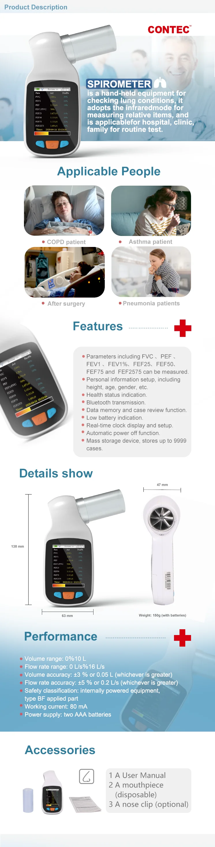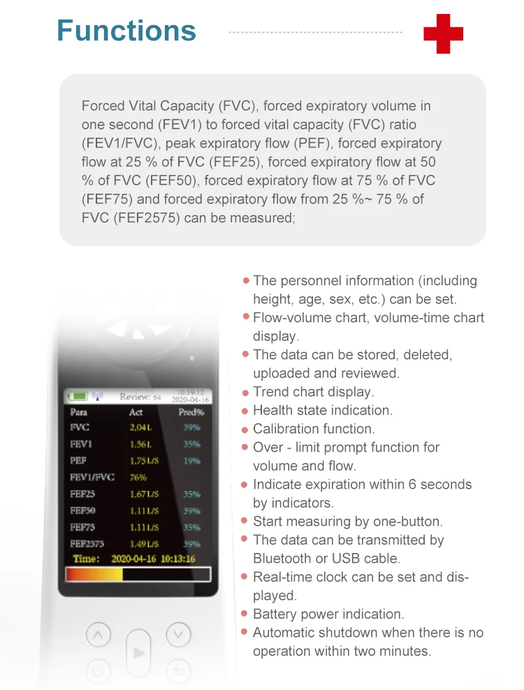 SPIROMETER es un equipo portátil para verificar las condiciones pulmonares, adopta el modo infrarrojo para medir elementos relativos y es aplicable para hospitales, clínicas y familias para pruebas de rutina.