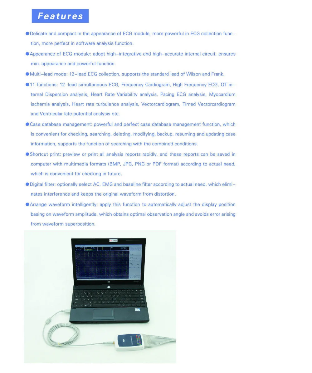 El dispositivo adquiere funciones que incluyen muestreo sincrónico de datos de ECG convencionales de 12 derivaciones y datos de ECG vectoriales de 3 derivaciones, diversas formas de análisis y diagnóstico, salida de informes y otras funciones.Como sistema de análisis de ECG integrado, el dispositivo puede reflejar el movimiento del corazón del usuario de manera oportuna y precisa.El dispositivo es aplicable para exámenes de ECG en instituciones médicas y de salud en todos los niveles, proporcionando una base precisa y confiable para el diagnóstico.