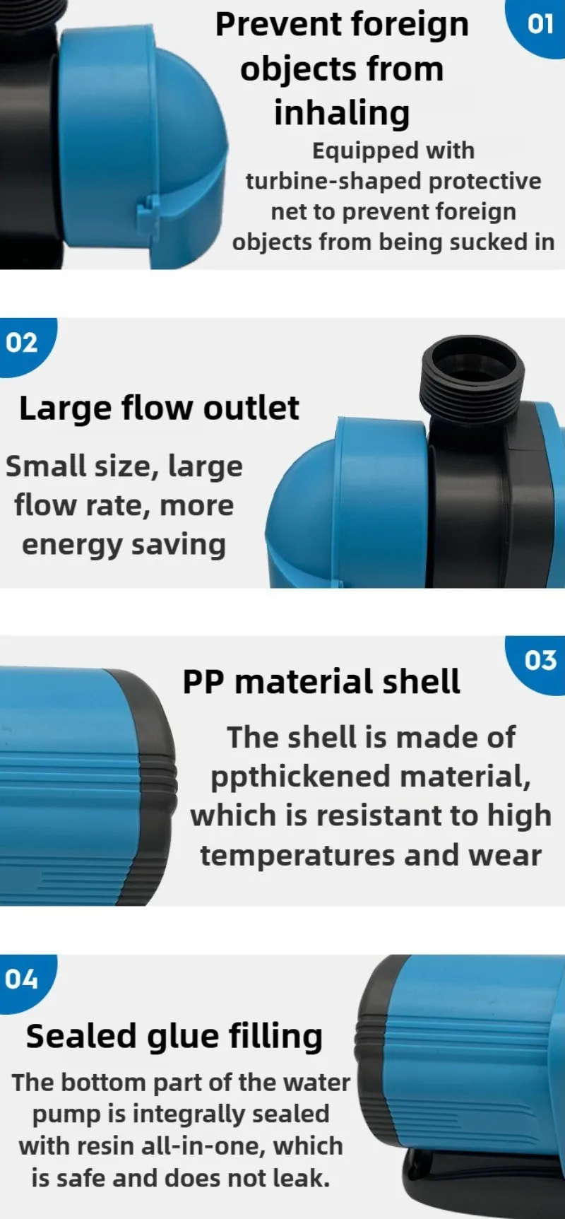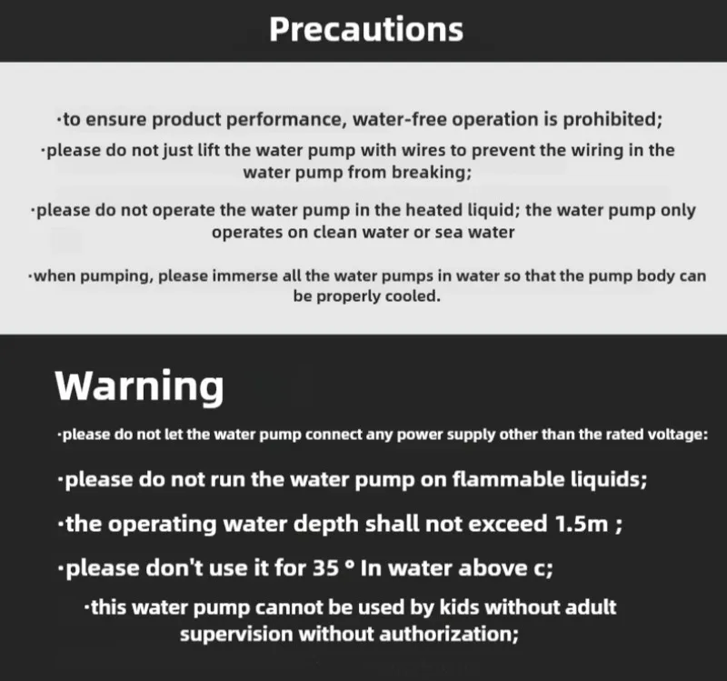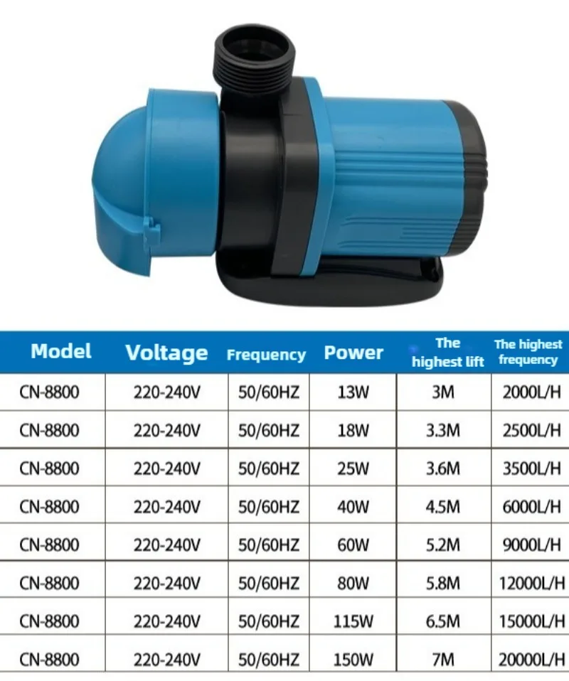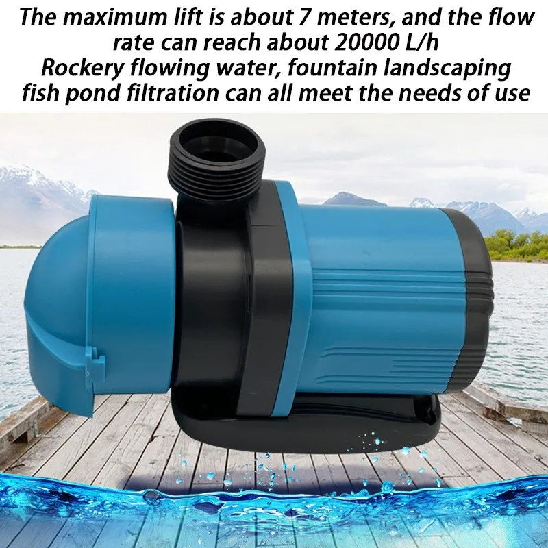 Dirigido hasta unos 7 metros, caudal hasta unos 20000 l/hSe puede utilizar agua corriente rocalla, paisajismo de fuentes y filtración de estanques de peces.Bomba de frecuencia variable de succión inferior ACAdopte un motor sin escobillas de onda sinusoidal para una potencia más fuerteFlujo de agua 10 marchas ajustableSin protección contra el agua, anfibio. Notas: Para garantizar el rendimiento del producto, está prohibido correr sin agua.No solo levante el cable para levantar la bomba, para no romper el cableado interno de la bomba.No haga funcionar la bomba en el líquido calefactor, la bomba solo funciona en agua limpia o de mar.Al bombear, sumerja la bomba en agua para que el cuerpo de la bomba pueda enfriarse adecuadamente. No conecte la bomba a ninguna fuente de alimentación que no sea el voltaje nominal.No opere la bomba con líquidos inflamables. La profundidad operativa del agua no deberá exceder los 1,5 metros: No utilizar en agua a más de 35oC.° C. Esta bomba no puede ser utilizada por niños sin supervisión de un adulto.