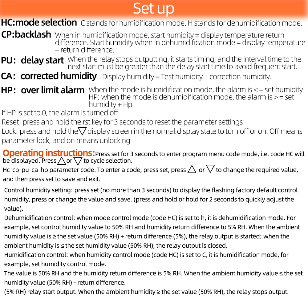 SET: Presione la tecla SET para ingresar la configuración del control de humedad y presione la tecla ▲ o ▼ para ajustar.